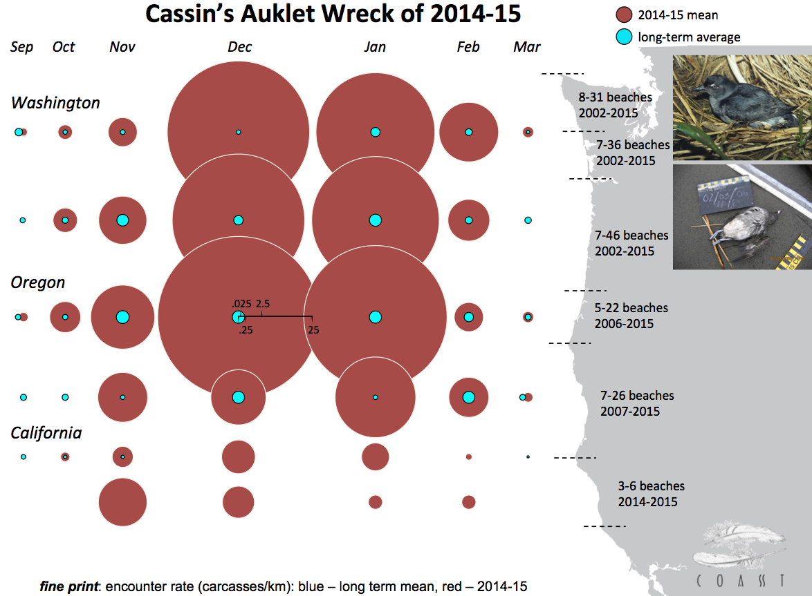 The waters off the coast of the Pacific Northwest have been unusually warm during the last couple of years, and this has had widespread and major impacts on the marine ecosystem. One of the more notable and publicized effects has been a harmful algal bloom (HAB) of unprecedented geographic scope, duration, and intensity. Here we will focus on a different sort of impact, and that is a Cassin’s auklet mortality event that occurred during the winter of 2014-15, as revealed by observations collected by the Coastal Observation and Seabird Survey Team (COASST). This mortality event provides clues about the recent state of the regional ocean because seabirds can be effective sentinels for the marine ecosystem.