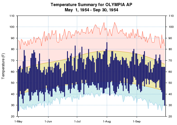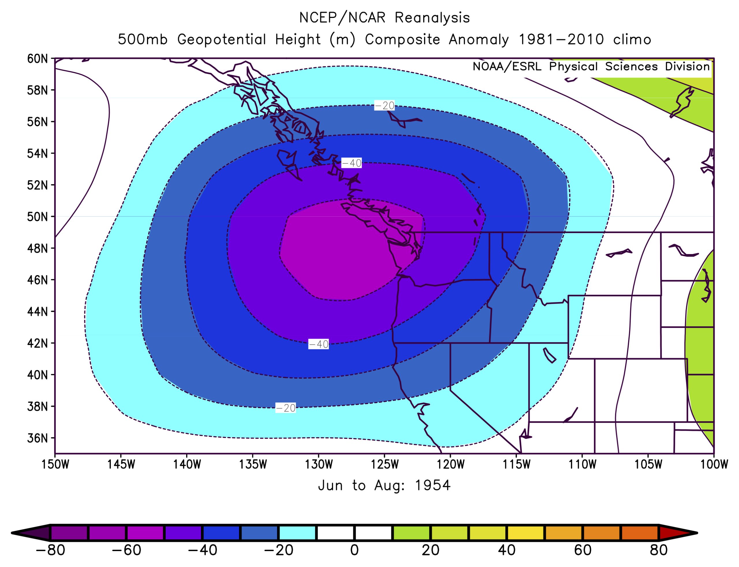 Are cool, and for that matter, warm summers just a fluke or are they connected to large-scale modes of the global climate system in a systematic, physically-consistent sense? Are these sorts of situations predictable? Is it possible for mean minimum temperatures in the present and future climate to be as cool as they were in 1954? The variability of seasonal weather conditions in the Pacific Northwest during winter has garnered a great deal more attention than that during summer but maybe that should not so much remain the case.