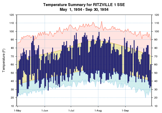Time series of daily maximum and minimum temperatures for May-September 1954 (a month was added on each side to show what it was like going in and coming out of summer) are presented for the western WA location of Olympia and the eastern WA location of Ritzville in Figures 1 and 2. There were some occasional warm days, especially in Ritzville, but consistently cool nights. At both locations, nighttime temperatures dipped down to the low 40s or below on multiple occasions, and during the period of June through August daily record lows were set 3 times in Olympia and 5 times in Ritzville. These low minimum temperatures undoubtedly helped push 1954 to the number one spot. Another recent year – 1993 – had a similar negative anomaly in magnitude for the maximum temperatures but had exactly normal minimum temperatures. As a result, 1993 was tied for the 4th coolest summer on record in terms of average temperatures.