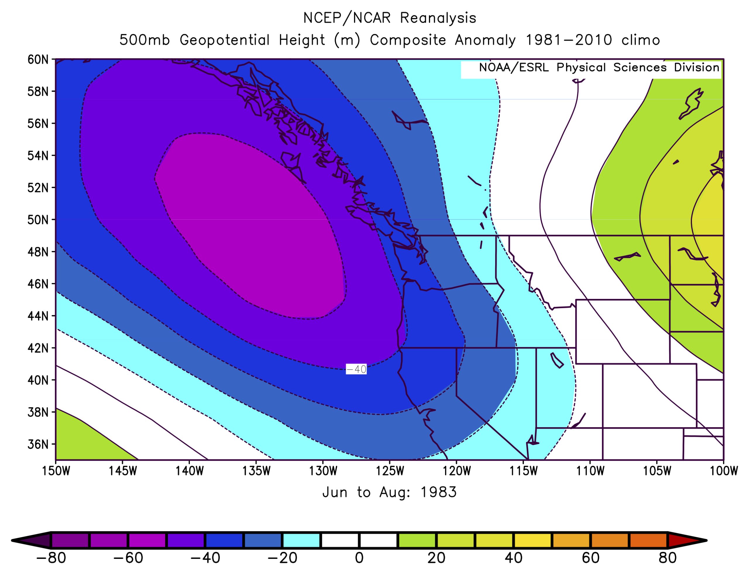 The regional atmospheric circulation was different during the especially cool summer of 1954 than during the wettest summer of 1983. As usual, we use 500 hPa geopotential height (Z) anomaly maps to contrast the two periods. The map for 1954 (Fig. 3) shows a substantial negative anomaly centered over the ocean south of Vancouver Island in a pattern producing anomalous flow from the southwest for WA. This situation favors the landfall of short-wave weather disturbances of North Pacific origin. During the summer these systems tend to be weaker and track farther north than during the winter, but bring plenty of clouds and often some rain to the Pacific Northwest. The 500 hPa map for 1983 (Fig. 4) includes smaller negative Z anomalies over WA and anomalous flow from the southeast. This pattern implies not as strong of a marine influence as in 1954, and instead the Great Basin as a source region to a greater extent than usual. The dregs of monsoonal moisture from the Great Basin can result in significant precipitation in WA state during the summer, especially east of the Cascades, and presumably that happened more than usual in 1983.