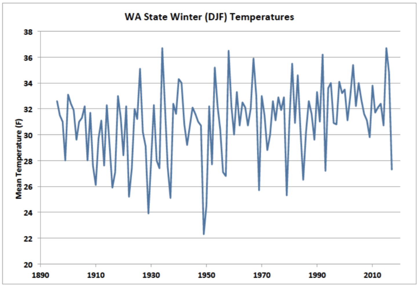 Figure 2: Washington state average temperatures for the months of December through February for the years of 1896 through 2017 (from NOAA/NCEI).