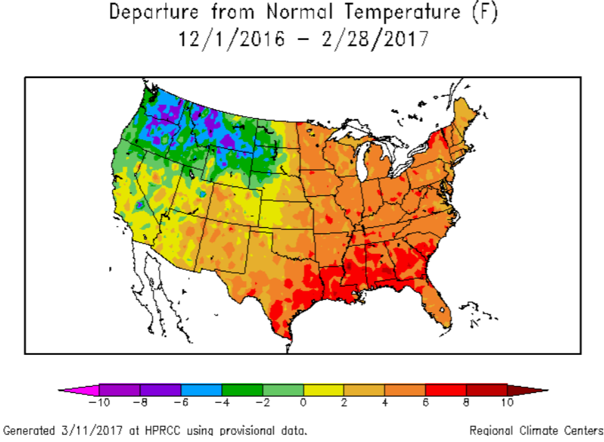 Figure 1: Mean temperature anomalies (F) for the period of December 2016 through February 2017 based on 1981-2010 climatological norms (from the High Plains Regional Climate Center).