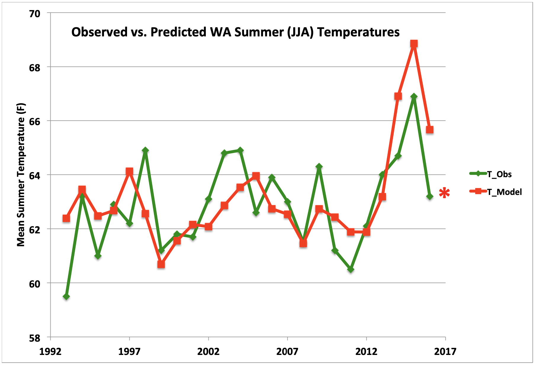 Recent work at OWSC has led us to ponder just how predictable summer mean temperatures are in Washington state. We constructed a simple model for a workshop on El Nino-Southern Oscillation (ENSO) and the seasonal weather of the western US with this question in mind. The model is based on NE Pacific ocean conditions, which have been of special interest and importance due to the marine heat wave in the NE Pacific of 2014-16.