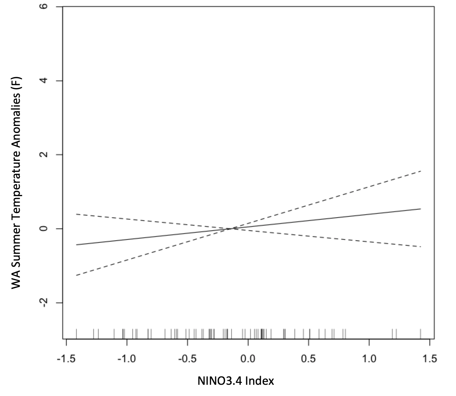 The results from a GAM predicting WA summer (June-August) temperatures using summer values of NINO3.4 and May values of regional SST are summarized here. For the period of 1949 through 2016, NINO3.4 is only marginally linked to summer temperatures, but the regional SST is related with a high degree of statistical significance (confidence level > 99.9%). The two predictors in combination account for about 27% of the variance in WA summer temperatures. The model performs better for the west side of the state (e.g., explains 40% of the variance in summer temperatures in the Puget Sound lowlands climate division). The functional forms in the relationships are illustrated in Figures 1 and 2 for NINO3.4 and the regional SST, respectively. A weak linear fit, with substantial uncertainty in the magnitude of the slope, was found for NINO3.4 with higher values of this index corresponding with warmer than normal summer WA temperatures. The fit for the regional SST was not linear, with higher SSTs corresponding with considerably higher summer temperatures. Note that there are greater spreads in the fit (as indicated by the dashed lines) for extreme values of this predictor, which makes sense since these years are relatively few in number.