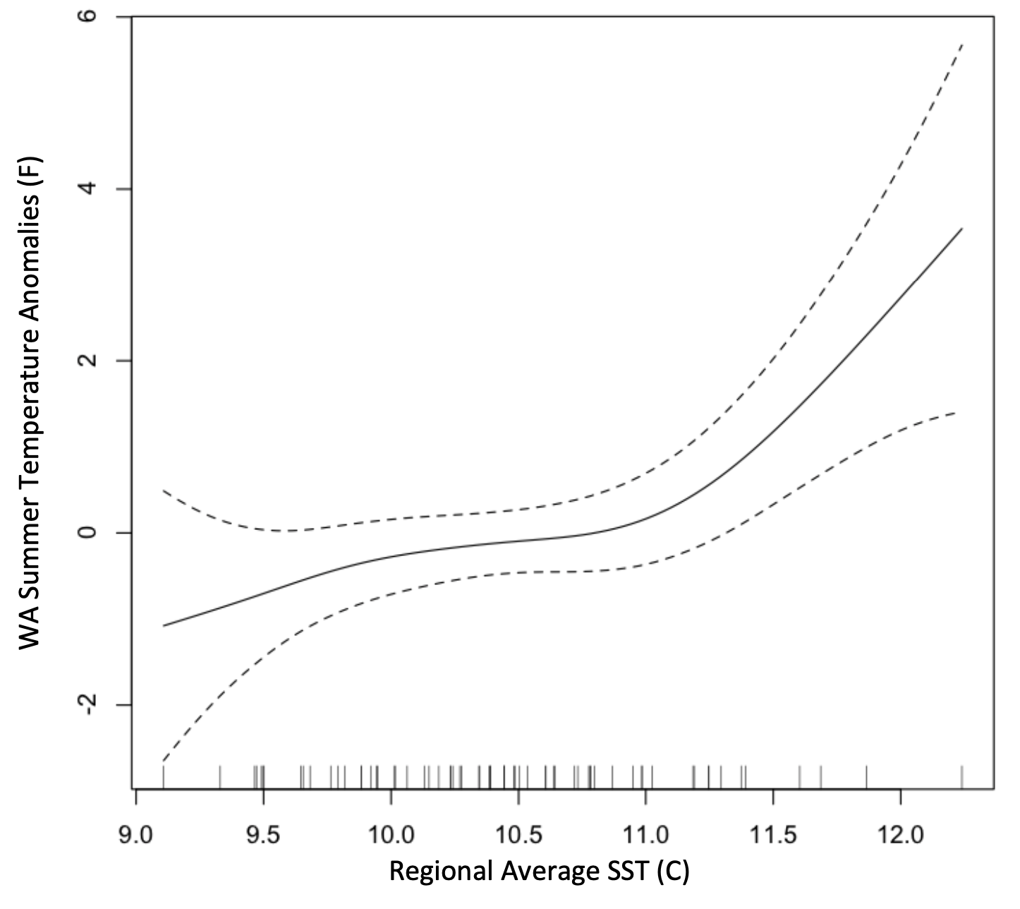 We have evaluated statistical relationships between observed seasonal temperatures and indices for ENSO (specifically the NINO3.4 index) and the regional SST (averaged over a box extending from 40 to 50°N and 140 to 125°W). We used the framework of a Generalized Additive Model (GAM), which is similar to the technique of multiple linear regression, with the additional less-restrictive feature of allowing nonlinear relationships between predictors and the predictand, i.e., the variable of interest (Hastie and Tibshirani 1990). We constructed and evaluated a variety of GAMs, and also conducted tests in which the early portion of the record is used for training, and the latter portion is used for validation and prediction. The atmospheric circulation anomalies responsible for seasonal weather signals also impact ocean conditions, so here we focus on the regional SST in the month of May prior to the forecast period.