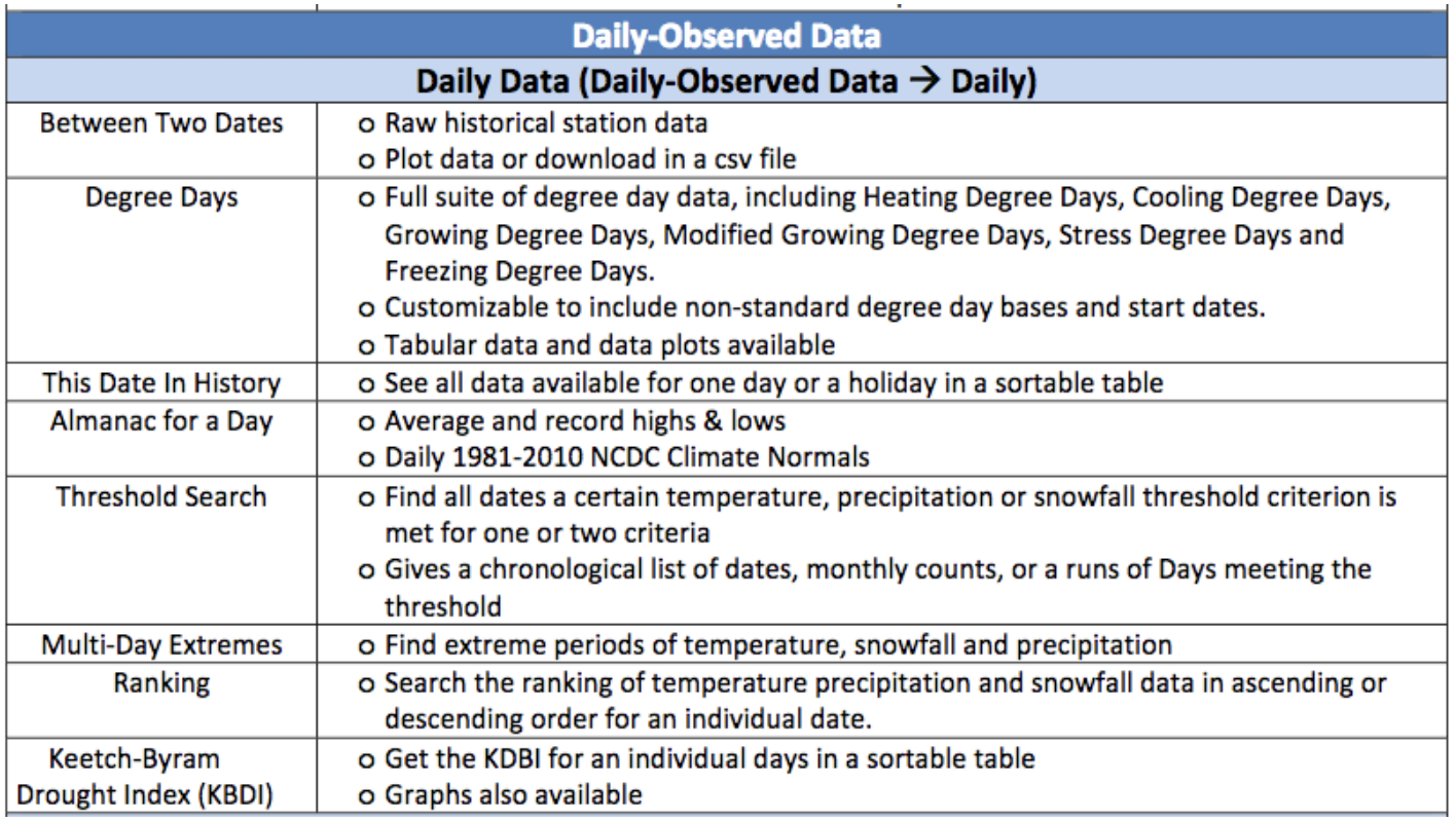 We begin with the web resource maintained by the Midwestern Regional Climate Center (MRCC), specifically the MRCC Application Tools Environment (Cli-MATE). This data portal (https://mrcc.purdue.edu/CLIMATE/) represents an easy way to download and graph weather and climate data from US stations; users must register but access is free. Both daily and hourly data are available; the latter type of historical data tend to be more difficult to find but this website makes it easy. Hourly data is only available here from the airport stations(SeaTac Airport, Spokane Airport, etc.). There are additional networks such as Agrimet, AgWeatherNet and RAWS with high-temporal resolution weather data available, of course, but those data are not available on either on the sites featured here. Returning to the Cli-MATE web site, one of its strong points is the intuitive interface for selecting station(s). One can specify the state and county or climate division of interest, see what stations are available, and then grab or graph time series of the variables of interest. The website also has some built-in capabilities to place daily data in historical contexts, as shown in this screenshot (Figure 1) from a help page (https://mrcc.purdue.edu/CLIMATE/productGuide.pdf). We find the threshold and multi-day options to be especially useful for characterizing extended periods of unusual weather. This brief discussion of Cli-MATE does not do justice to all of its goodies. Readers of this newsletter are encouraged to explore for themselves. But be forewarned, one may spend more time doing so than anticipated since such explorations are liable to be so interesting.