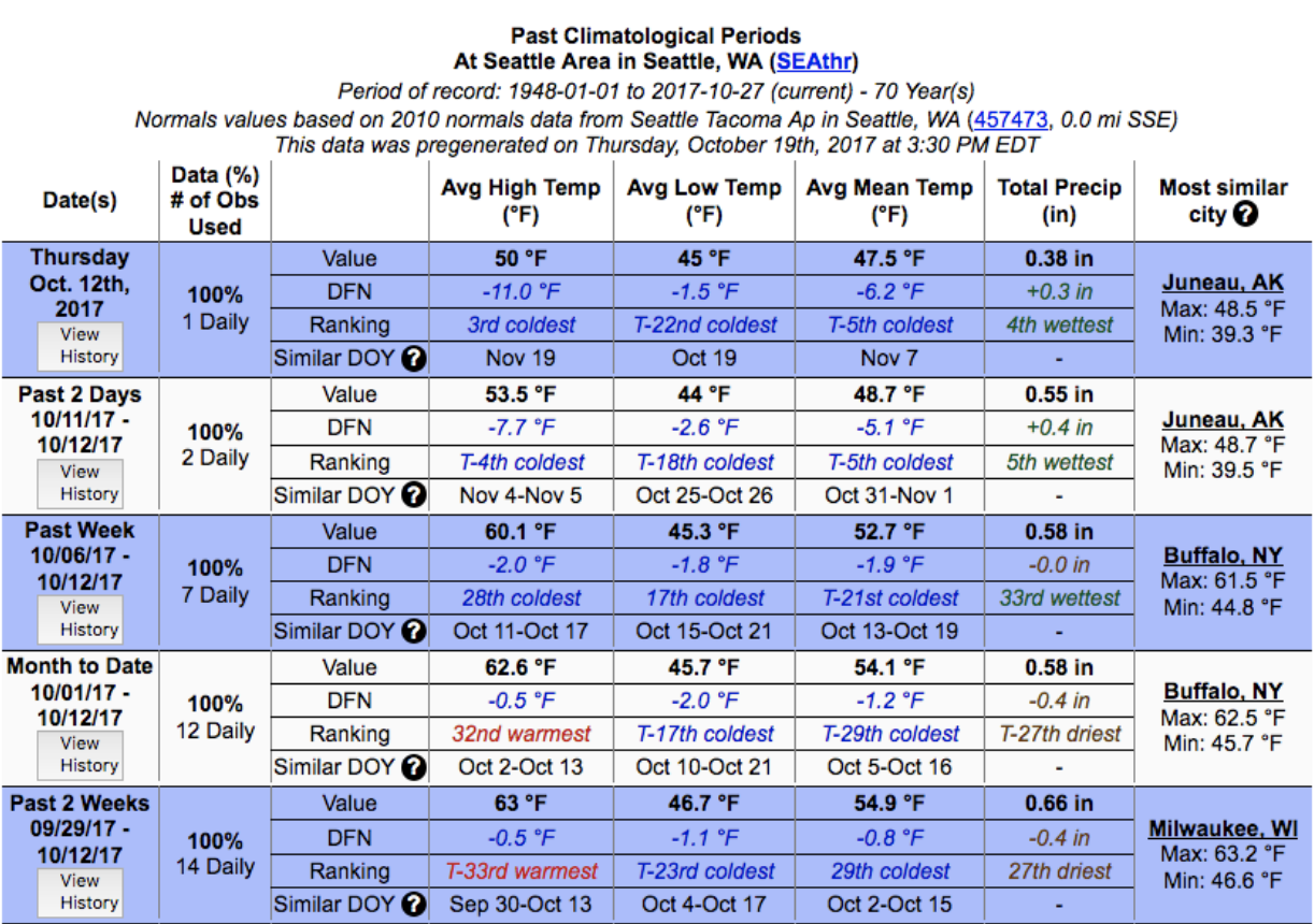 The more recent web resource is also provided by a regional climate center, specifically the Southeast Regional Climate Center. The new tool is called the Southeast Climate Perspectives Map (https://sercc.com/climate-perspectives/), which may not sound very promising for those of us interested in the weather and climate of the Pacific Northwest, but actually includes data for the entire country. Moreover, it provides not just a tab for “Regional Map Perspectives” but also tabs for “Station Perspectives” and “Streaks & Thresholds Perspectives”. Its focus is on recent weather observations, and features a variety of ways of putting the recent weather in historical and geographic contexts. A good way to start is to simply go to the following easily navigable web site: https://sercc.com/climate-perspectives/. Use the Google interface to zoom in on the area of interest, and it’s off to the races. Here we do not attempt to describe all of the available features; those interested are advised to visit the product guide, or just rummage around. We feel that an especially intriguing feature is with the Station Perspective. Clicking on an individual station yields a table of how the average, minimum, or maximum temperatures or total precipitation over time scales ranging from 1 day to 2 years compare with historical records, including what days of the year they most closely resemble in the climatological record, and the most similar US city in terms of the climatological averages. This kind of query can be made for any day in the last 3 months. For example, the maximum temperature at Sea-Tac Airport (SEA) on 12 October 2017 was 50°F, which seems quite chilly. The application shows indeed that this value represents an anomaly of -11°F and was the third coldest 12 October on record. The most similar day of the year from a climatological standpoint based on maximum temperature is 19 November, and the most similar city in terms of the weather for the day is Juneau, AK. A partial view of the table of information that is provided is shown in Figure 2.