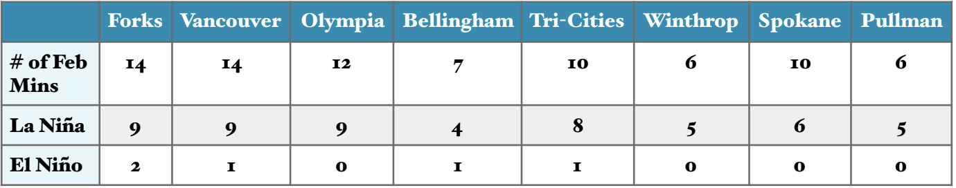 As reported above, the last 2 weeks of February were quite chilly, with numerous locations setting all-time lows for the date on the 23rd. Many places have had their coldest temperatures of this winter in late February, even though the nights are noticeably shorter than in December and January. We were curious about how often this sort of thing happens based on the historical record, with an arbitrary start of the winter of 1949-1950. Our procedure was to simply catalog the instances when February (or in a couple of cases, March) included the coldest minimum temperature of the winter. This was done for 4 stations on the west side of the state (Forks, Vancouver, Olympia, and Bellingham) and 4 stations on the east side (Tri- Cities, Winthrop, Pullman, and Spokane Airport).