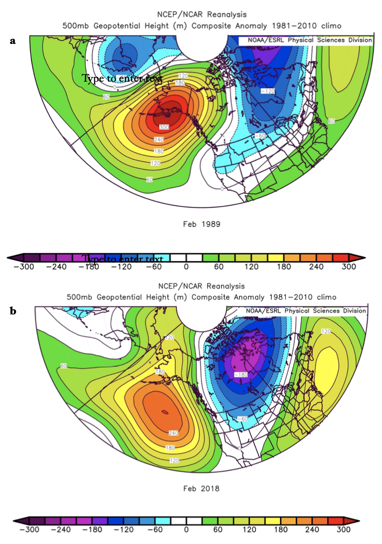The large-scale atmospheric circulation anomalies for February 1989 and 2018 resemble one another, as illustrated by the 500 hPa geopotential height anomaly distributions of Figures 1a and 1b. It bears emphasizing that the February of 1989 was much colder than that of 2018 in terms of both the monthly mean and lowest daily minimum temperatures. The easterly component to the anomalous flow shown in Figure 1a implies that much more of a continental source for the air mass during 1989.