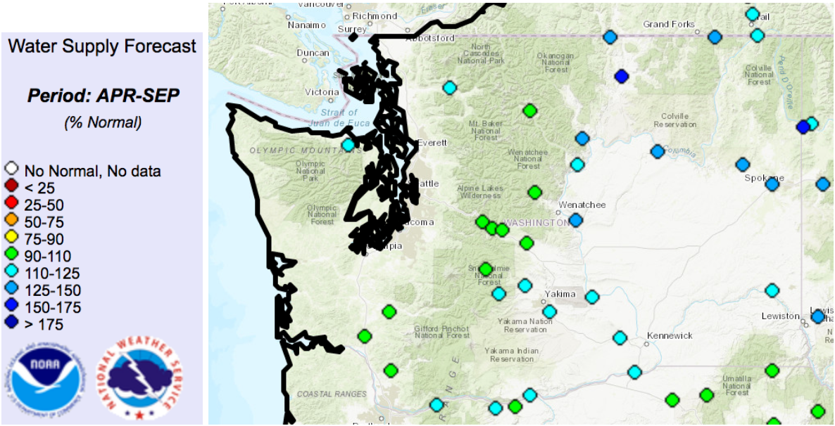 Figure 4: April through September 2018 water supply forecast for WA as of April 27, 2018 from the NWS Northwest River Forecast Center.