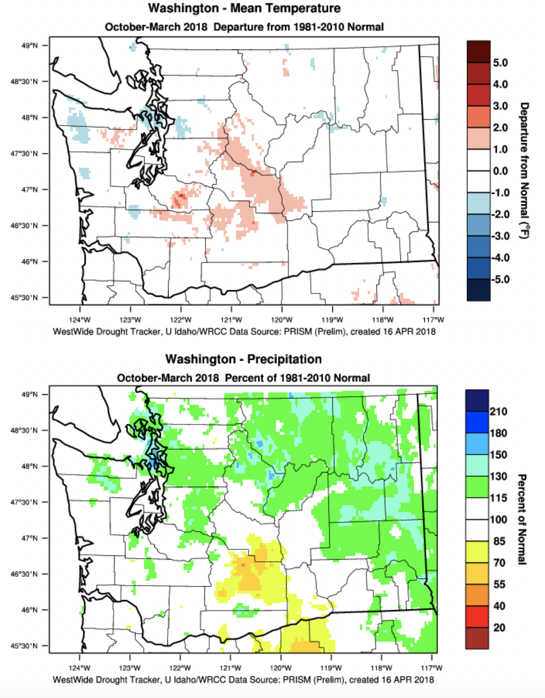 Average statewide October-March temperatures were exactly normal (36.7°F; 0.0°F anomaly from 1981-2010), and most regions were near-normal as well. Figure 2a shows a few areas in central WA with warmer than normal temperatures, but otherwise Oct-Mar temperatures were within 1°F of normal. For precipitation, most of the state was wetter than normal (Figure 2b) and the average over the state was 3.11” wetter than the 1981-2010 normal. The exception is the majority of Yakima county, where winter precipitation was below normal.
