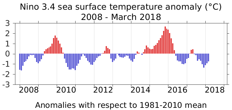 Figure 1: SST anomalies from January 2008 through March 2018 in the Niño3.4 region of the tropical Pacific (figure by Todd Mitchell – JISAO).