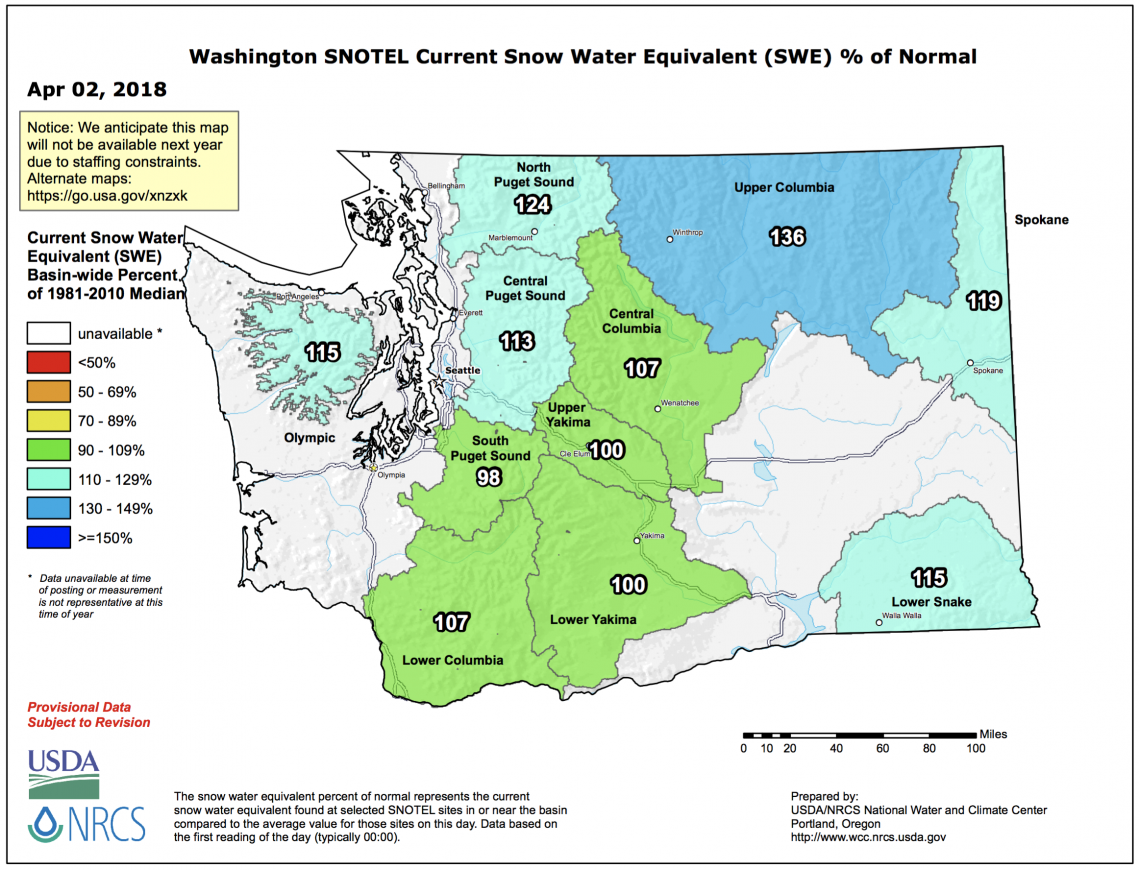 Figure 3: Snowpack (in terms of snow water equivalent) percent of normal for WA as of April 2, 2018.