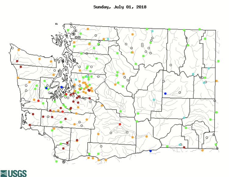 The total statewide averaged precipitation for the 2018 water year to date (1 Oct through 30 June) has been about 3.6” above normal. There was a healthy snowpack on 1 April — the traditional end of winter from the snowpack perspective — with snow water equivalent (SWE) values ranging from about 136% of normal in the Upper Columbia region to 98% in the southern Puget Sound region. The snowpack situation continued to improve relative to climatological norms through the middle of April due to abundant precipitation across the whole state. It might therefore be expected that streamflows in WA should be in fine shape as the warmer and drier weather of summer approaches. But that is not necessarily the case.