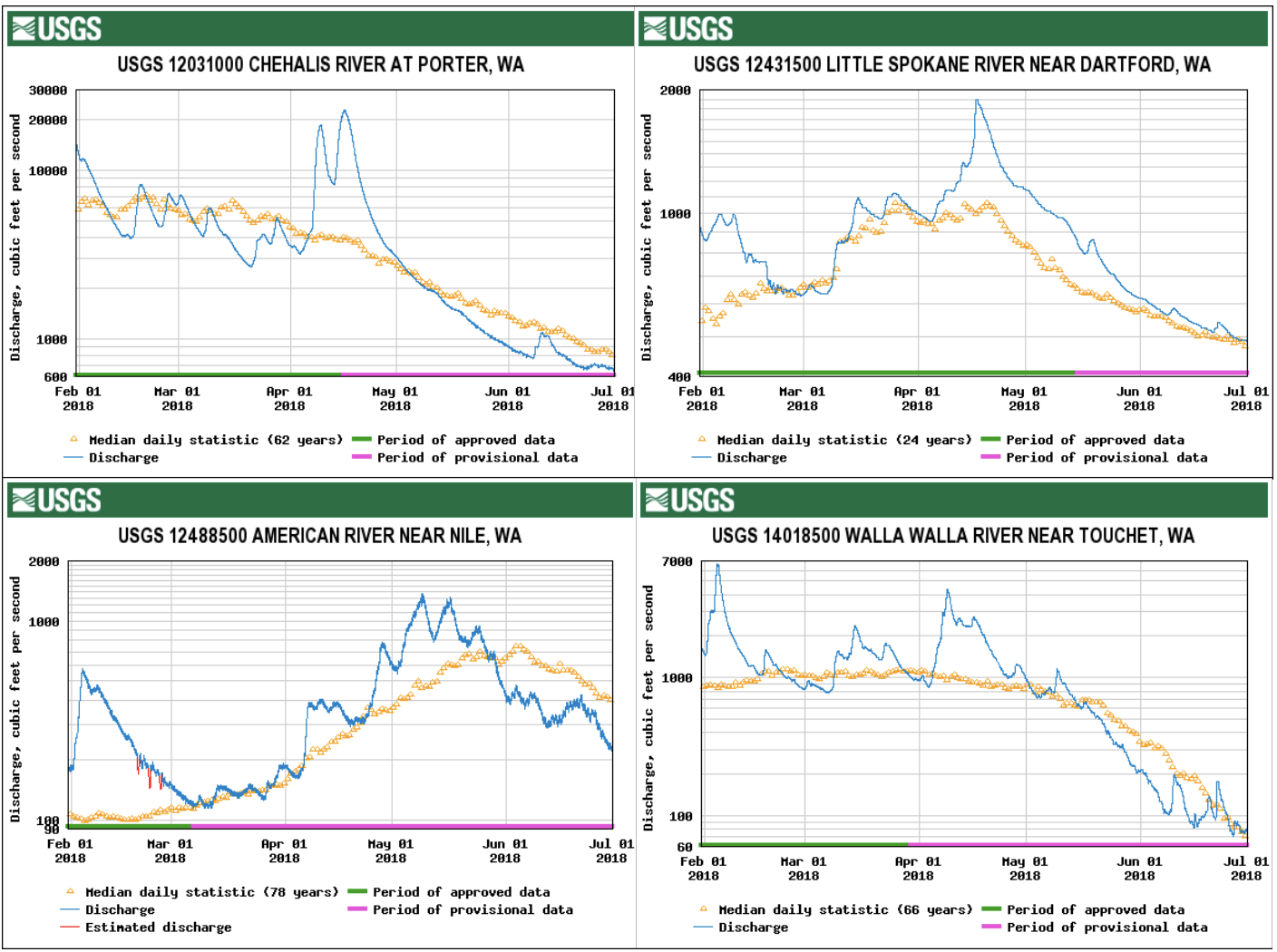 We can blame the aforementioned warm and dry weather in May followed by a dry June. The warmth in May resulted in rapid snowmelt in the higher elevation basins. The concerns then were too much rather than too little water, with major flooding in Ferry, Okanogan and Pend Oreille counties. The lack of rainfall in May that lingered into June meant little new supply for the rain-fed streams at lower elevations, especially on the west side of the Cascades. The rapid change in conditions can be seen in the time series of daily streamflow from 1 February through 30 June on 4 rivers in WA that are shown in Figure 2. A particularly steep decrease has been observed on the Chehalis River near Porter; it is interesting that April mean value of 8641 cfs during 2018 was the 2nd highest in the record back to 1953 while the mean of 800 cfs for June is in the lowest 25 percentile. The Little Spokane River is holding up better, at least in part because the SWE was so much greater than normal in northeastern WA. The Walla Walla River in the southeast generally has low flows by early summer. Note that the current year features a relatively early onset of these low flows, with presumably ecological impacts as well as water supplies. A similar shift in timing is also shown in the hydrograph for the American River, which experienced its peak spring flow about 2-3 weeks early.