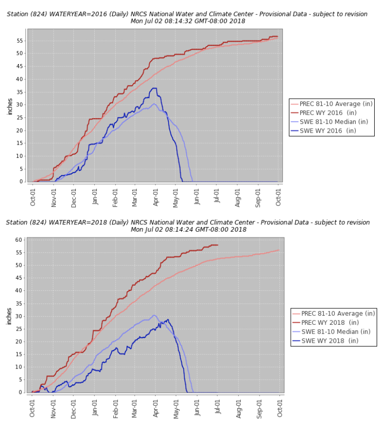 The streamflows across the state have certainly gotten the attention of the Water Supply Advisory Committee (WSAC) for WA state headed by the Department of Ecology. While current conditions are not nearly as severe as those in early summer of 2015 following the dearth of snow in the winter of 2014-15, there are concerns for various pockets of the state. There are also similarities to the 2016 water year, when really warm April temperatures caused our normal to above normal snowpack to melt early and fast. The SWE trace for the Touchet Snotel site (Walla Walla basin) in Figure 3 shows these marked drop offs in both water years. It is starting to look like this will be one of those years in which we will be eagerly awaiting rather than dreading the return of the wet weather of fall.
