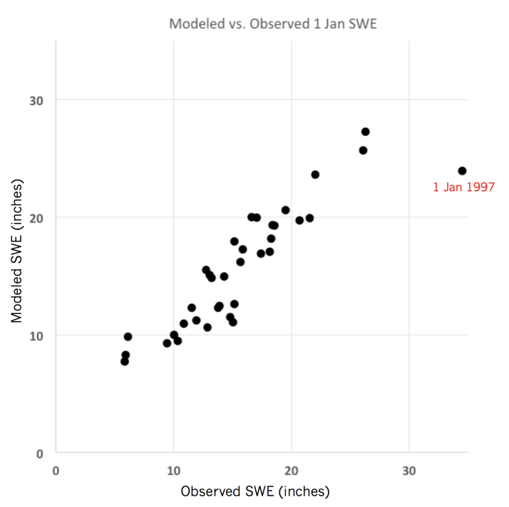 Figure 2: Observed values of composite 1 January SWE (x-axis) versus modeled SWE (y-axis) based on a generalized additive model (GAM) using 500 hPa Z, 850 hPa U, regional SST, and NINO3.4 as predictors.