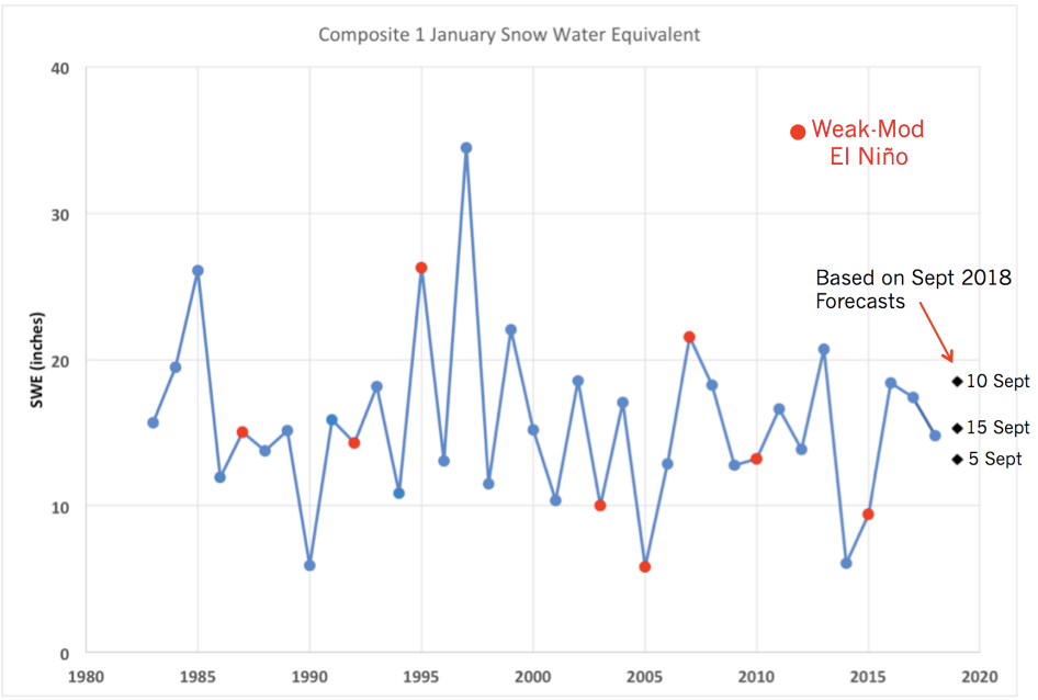 Figure 1: Composite values of snow water equivalent (SWE) in inches on 1 January for 1983-2018. Red dots indicate years with weak-moderate El Niño events. The three black diamonds at the right show forecast values of SWE for 1 January 2019.