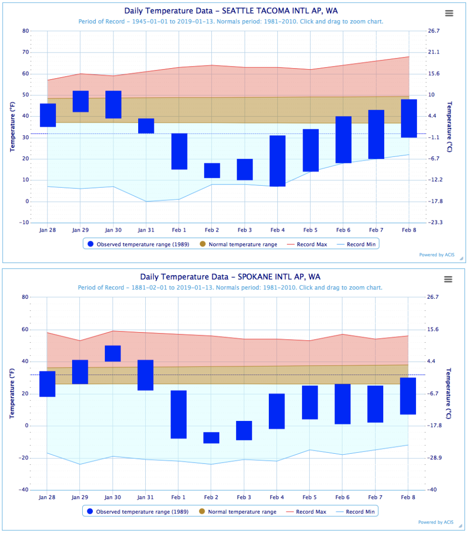The cooling is summarized here in terms of the maximum and minimum temperatures recorded at Sea-Tac (KSEA) and Spokane International (KGEG) Airports from 28 January through 8 February 1989, as plotted in Figure 1. The coldest temperature at Sea-Tac was 7°F on 4 February, with daily minimum temperature records set during 4 days in a row. The average temperatures on 2 and 3 February were about 28°F below normal. But Spokane did even better in some ways. It was especially cold on 2 February; the combination of a maximum temperature of -4°F and a minimum temperature of -11°F represented an average temperature about 39°F below normal.