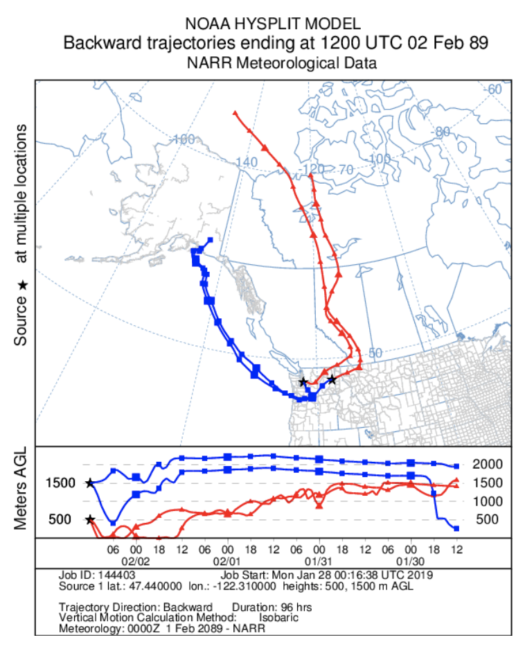 Past reviews of noteworthy events in our newsletter have often included 500 hPa geopotential height anomaly maps to summarize the overall atmospheric circulation. This time we thought of taking a different tack, with the goal of specifying the source(s) of the cold air that visited WA in early February 1989. This can be done through estimation of back trajectories using the HYSPLIT application maintained by NOAA’s Air Resources Laboratory. What we show here in Figure 2 are the estimated trajectories using the isobaric option, which essentially ignores vertical motions (which are prone to substantial errors). These results indicate continental origins for the air in both locations at the height of 500 meters (red lines), and southeast mainland Alaska as the source for the air at 1500 meters (blue lines). The latter’s journey over the ocean would have allowed it to pick up some moisture.