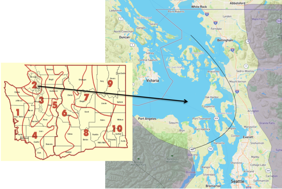 This is the second installment of the “Climate Divisions of WA” series, and we will focus on Climate Division 2 – the NE Olympic-San Juan Climate Division (Climate Division 1 is featured in the August 2018 edition of our newsletter). Figure 1 shows the geographical extent of the division, encompassing the farthest northeast portion of the Olympic Peninsula, a small western portion of Skagit county, and the entirety of Whidbey Island, Camano Island, and the San Juan Islands. It is the smallest climate division in area in WA, but the elevation ranges from sea level to 2,398’ on Mt. Constitution in Orcas Island. Principal municipalities include Anacortes, Coupeville, Friday Harbor, Langley, Oak Harbor, Port Angeles, Port Townsend, and Sequim. It also includes Native American reservations for the Jamestown S’Klallam, Samish, and Swinomish tribes.