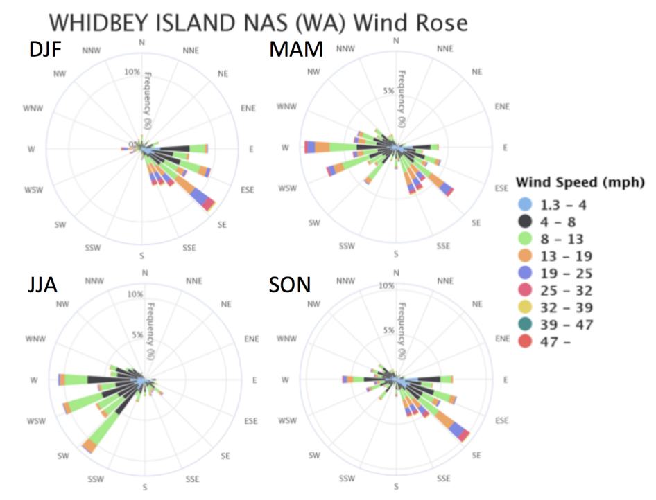 Seasonal wind rose charts for the Whidbey Island Naval Air Station are shown here as an example of the wind climatology for the climate division (Figure 3), though of course it only really represents one location. This station in particular is a windy one, thanks to its location on the northern NW coast of Whidbey Island (northwest of Oak Harbor), which exposes the station to westerly winds at the east exit of the Strait of Juan de Fuca. Those westerly winds are common in spring into early fall and are especially consistent during the summer due to high pressure off the coast of WA. Winter features winds almost exclusively from the south-southeast through east, in association with lower pressure over the ocean and higher pressure over the inland Pacific NW. Landfalling storms can be accompanied by prominent mesoscale pressure and wind perturbations, with especially rough conditions often occurring in Admiralty Inlet between Port Townsend and Whidbey Island.