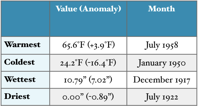 On the topic of extremes, Table 1 shows the warmest, coldest, wettest, and driest months for the climate division since 1895. The warmest (July 1958), coldest (January 1950), and driest (July 1922) months are the same months that were identified as those records for Climate Division 1, which is no surprise considering the large scale regional weather patterns that need to be in place to produce these extremes. The January 1950 anomaly is especially impressive for this climate division, with average temperatures a whopping 16.4°F below normal for the month. The record wettest month for the climate division (December 1917) occurred some time ago, with an anomaly of +7.02” that corresponds with some historically high streamflows in western WA.