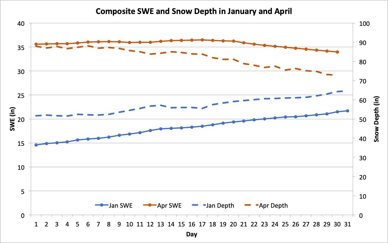 First, we averaged all the data for each day of the month at each site, and then formed a grand average for the 5 sites. The results of this exercise are shown in Figure 1. On average, January starts out with a depth and SWE of 51.6 and 14.6”, respectively, and ends with a depth and SWE of 64.6 and 21.7”. Over the course of the month, there is greater growth in a proportional sense in SWE than in depth. More specifically, the average ratio of depth to SWE goes from about 3.5 to 3. The month of April starts out with an average depth and SWE of 87.9 and 35.6”, respectively, and ends up with 72.8 and 34.0”. By the end of the month that ratio is only about 2.1. This signifies a very “ripe” snowpack, with the high water content of the snow implying that melting is underway or imminent.