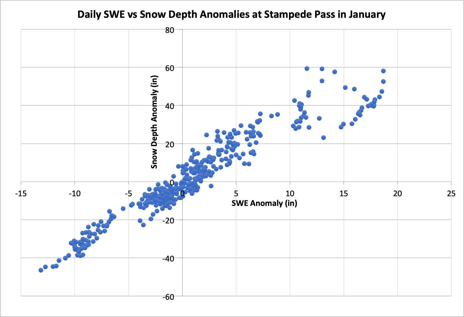 We next examined the daily variability in snow depth and SWE. Correlations between daily values considering all years during January was between 0.92 and 0.96 at four of the sites; Harts Pass was somewhat lower at 0.86. During April, the correlation coefficient was between 0.90 and 0.96 with Harts Pass again exhibiting the most variability. Removal of the daily climatology and hence the seasonal cycle in the ratio between snow depth and SWE did not impact the correlation much – the year-to-year variability is much greater than that effect. This is illustrated in a scatterplot of daily anomalies in depth and SWE at Stampede Pass for the month of January (Figure 2). We were struck by the tightness of the linear relationship between the two variables, with the exception of the very highest values of SWE, which apparently can be accompanied by a sort of roll-off in snow depth anomalies.