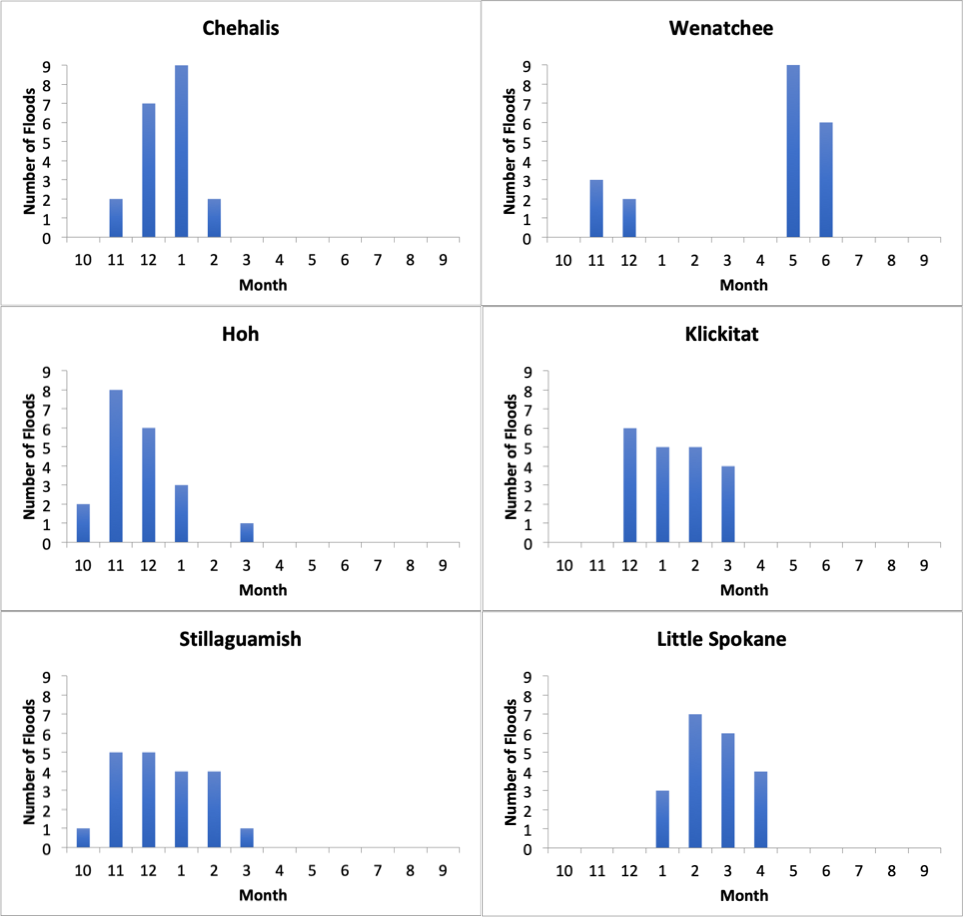 Figure 1 shows the monthly mean streamflow in standardized format for all 6 rivers, illustrating some major distinctions that can be made for these rivers. The Chehalis River is the most rain dominant of the bunch, and is classified as such. Rain dominant basins have their highest streamflow in the fall, when most of the basin precipitation falls as rain. The other western WA rivers –the Stillaguamish and Hoh – have their highest flows in the fall as a response to rain as well, but they also have an increase in monthly streamflow in April/May (Stillaguamish) and June (Hoh). These are known as “mixed basins” since there is a clear contribution to streamflow from melting snow at higher elevations. The Klickitat is also a mixed basin, with peaks in both February and May. Finally, the Wenatchee River is an example of a “snow dominant” basin; May and June have relatively high streamflows due to the snowmelt contribution. The Little Spokane is a snowmelt basin as well, with an earlier peak streamflow in April. It is worth pointing out that all of the rivers, regardless of their classification, have their lowest flows in August and September, a time of year when much of the state has its greatest need for water. Perhaps the monthly timing of the peaks and nadirs of streamflow are already well- appreciated, but do they necessarily line up with the major floods occurring on these rivers?