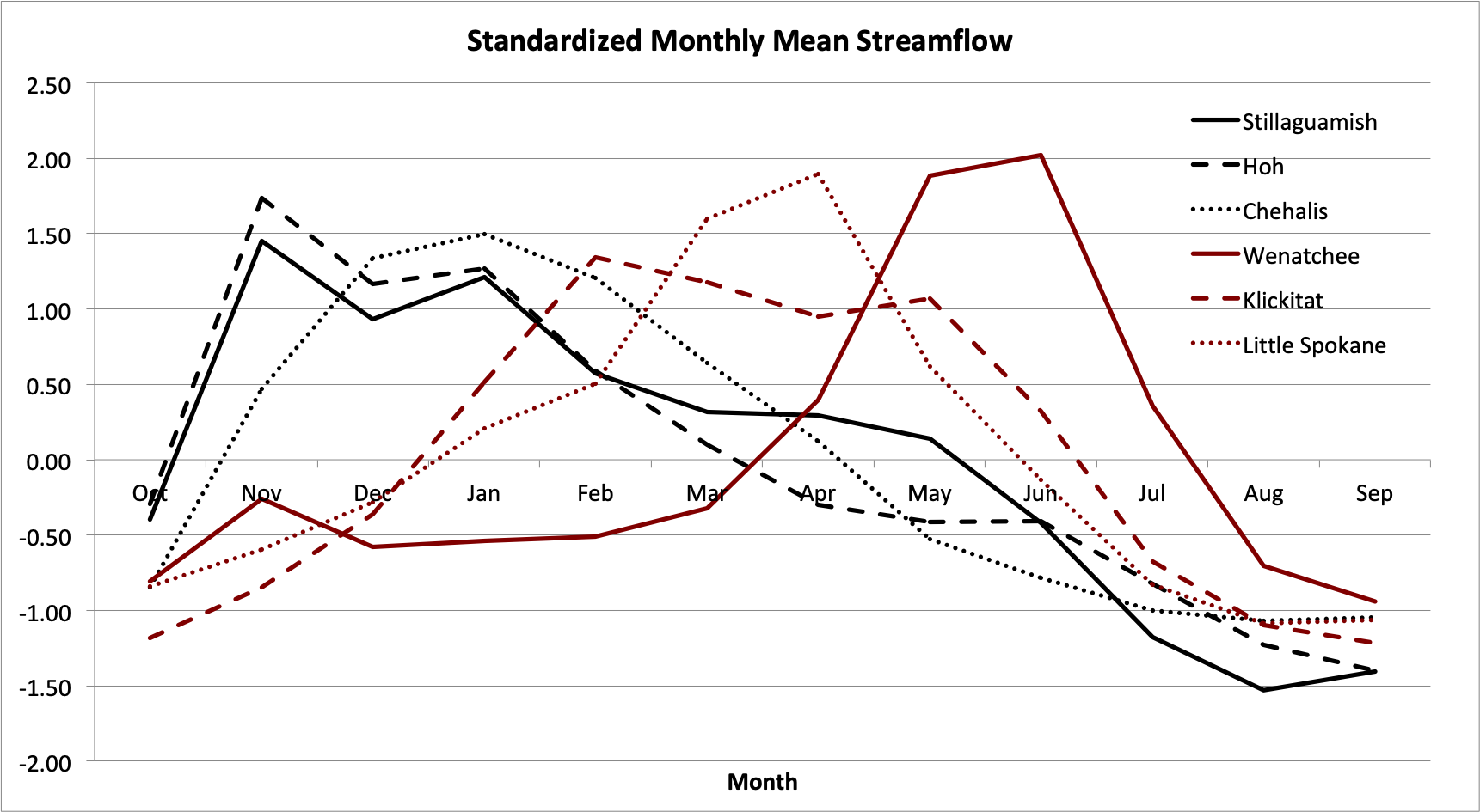Towards that end, we considered 6 mostly unregulated rivers – 3 in western WA and 3 in eastern WA – and examined the standardized monthly mean streamflow and the timing of the top 20 peak streamflow events. The records are all relatively long and are as follows: Chehalis River at Porter (1947-2017), Hoh River at Highway 101 (1961-2017), Stillaguamish River at Arlington (1929-2017), Little Spokane River at Dartford (1929-2019),Wenatchee River at Peshastin (1929-2019), Klickitat River at Pitt (1929-2017).