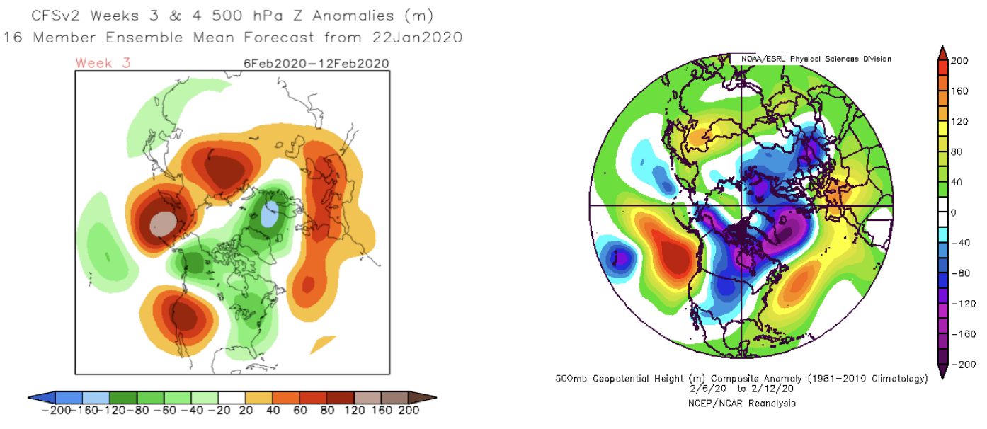 Figure 1: An example of the CFSv2 forecast initialized on 22 January 2020 for 6-12 February (left) and the verification (from ESRL; right) that was a “hit”. The week-4 forecast from this same initialization also verified (not shown).