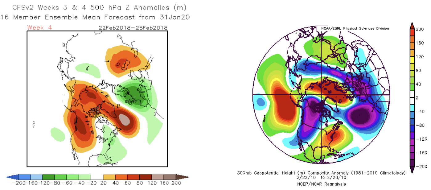 Figure 2: An example of the CFSv2 forecast initialized on 31 January 2018 for 22-28 February (left) and the verification (from ESRL; right) that was a “bad miss”.