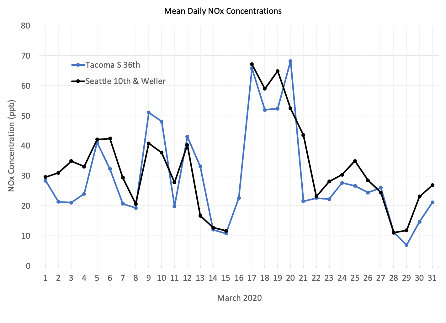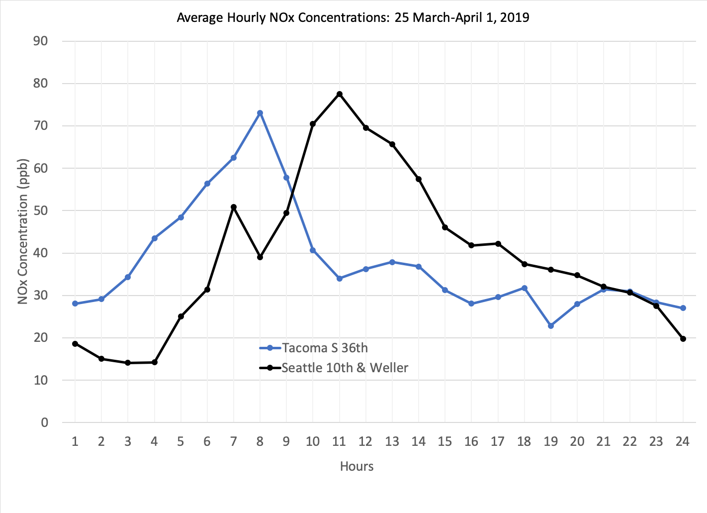 One way to gauge the typical effects of automobile traffic on NOx concentrations is to consider how NOx values vary with time of day, using past hourly data. Towards this end, we grabbed the data from the last week of March 2019. This period was generally warmer than what the region has experienced in late March of 2020, but it did include a couple of days with measurable rain, and hopefully it is representative of typical NOx conditions during the time of year. The average concentrations of NOx at Tacoma and Seattle as a function of time of day for the period of 25 March through 1 April 2019 are plotted in Figure 1. The record from both stations features a peak early in the day, specifically 8 AM local time in Tacoma and 11 AM in Seattle. We interpret these peaks due to the enhanced emissions accompanying the morning rush hour; we have no explanation for the difference in timing save that it is liable to relate to local effects such as winds, mixing heights, and station siting. We reckon that the greater atmospheric mixing causes the declines over the course of the afternoon found for both locations. Minor bumps show up at 6 PM in Tacoma and 5 PM in Seattle. We also looked at the daily peaks in NOx at the Seattle station over the last week of March and first week of April of 2019 (not shown). Over that period, 11 of the peaks occurred in the morning, and 3 occurred from 1 PM to 7 PM. The important point here is that NOx concentrations in the higher population areas of the Puget Sound region are reduced during the evening and late night hours when traffic is lighter.