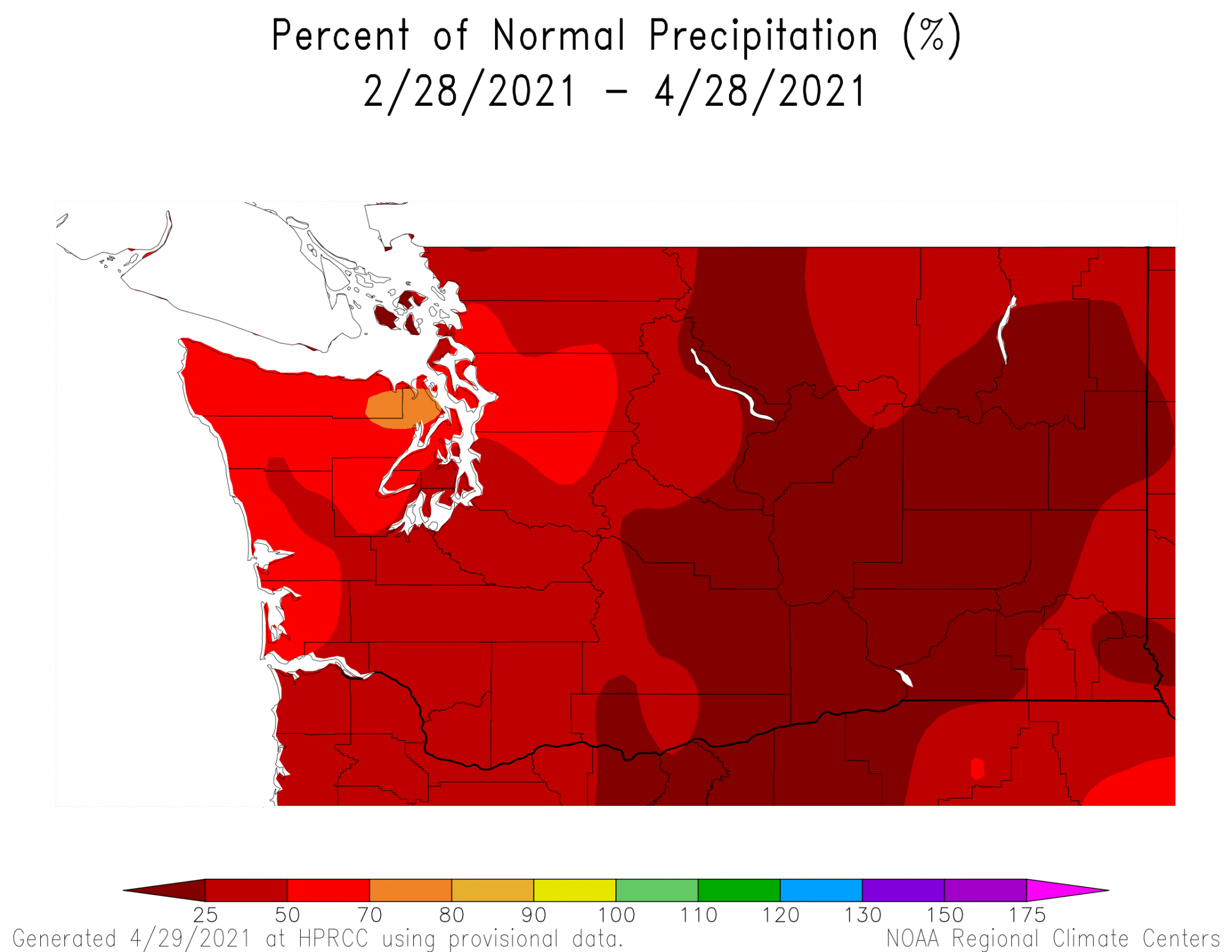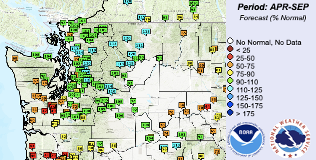 The cooler and wetter pattern that began in February brought huge gains in snowpack in the mountains. By April 1 (Figure 5), snowpack was above normal (119-152% of normal) throughout the Cascade and Olympic Mountains. However, the picture isn’t all completely rosy. March and April were exceptionally dry; March ranked as the 11th driest on record and the two months combined (Figure 6) only received between 5 and 50% of normal precipitation for a majority of the state. March and April are still relatively wet months climatologically, and the precipitation deficits range between 3 and 12” of precipitation for the two months combined. In addition, a warm spell in mid-April caused a period of pronounced melting of our mountain snow around the state. Temperatures in the coming weeks will dictate whether we see early meltout, or whether cooler temperatures cause a more typical meltout curve through May and June. The Apr-Sept streamflow natural forecast as of April 29 indicates below normal streamflow in southwest and southeast WA (Figure 7). Low forecasts that range between 40 and 49% of normal streamflow are shown for the South Fork of the Palouse at Pullman, as well as the Newaukum near Chehalis, and the Chehalis near Centralia, Grand Mound, and Doty. The rivers on the coast and in southwest and southeast WA that have below normal forecasts are primarily rainfed, and are responding to the recent drier than normal weather. The snowmelt driven rivers throughout the Cascades and Olympics have normal to above normal Apr-Sept streamflow predicted.