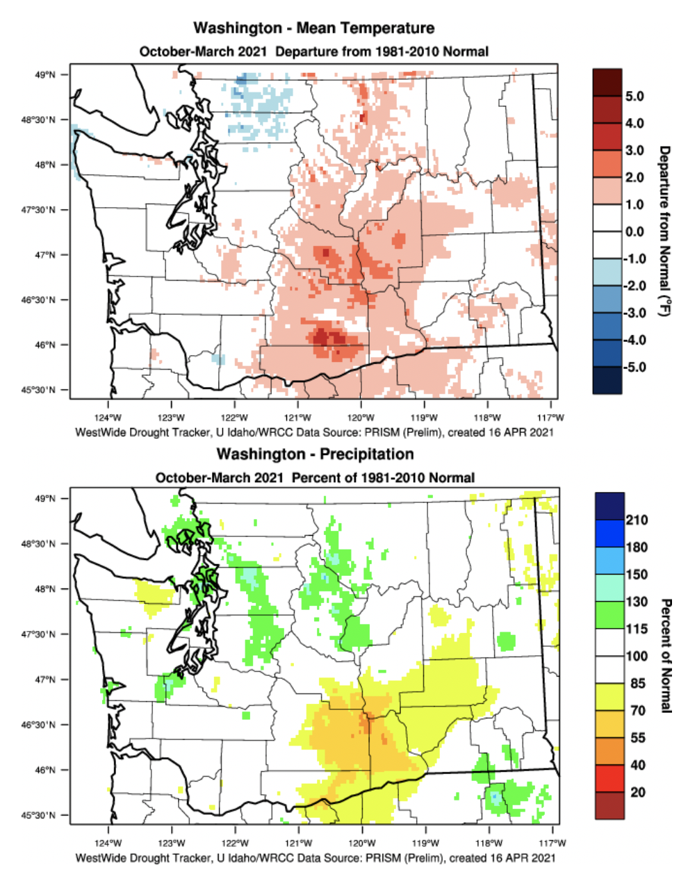 Figure 2 shows the departure from average temperature and percent of normal precipitation across the state from October 2020 through March 2021. Averaged statewide, both temperatures and precipitation were near-normal, with temperatures +0.9°F above the 1981-2010 normal and precipitation at 102% of normal. Ranking 126 historical Oct-Mar periods, temperatures were in the warmest quarter historically, specifically as the 22nd warmest. As shown in Figure 2, temperatures were generally warmer than normal east of the Cascade crest, ranging between 1 and 3°F above normal. Parts of the northern Puget Sound region were cooler than normal for Oct-Mar. There was some variability in precipitation as well, with some of the Lower Columbia Basin only receiving between 55 and 85% of normal precipitation. This region is the same area that experienced precipitation deficits last winter (2019-20) and is therefore experiencing both short and long-term dryness.