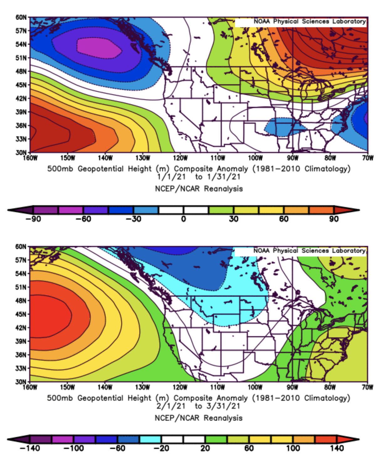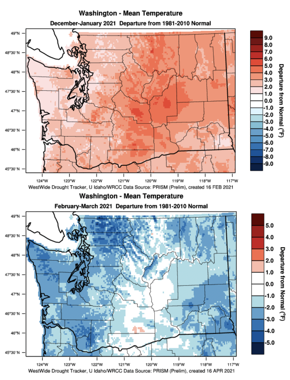 There was also some substantial monthly variability within the winter. Statewide average temperatures were near-normal for October and November with a mix of wet and dry regions. December and January were considerably warmer than normal. Together, the two-month period ranked as the 10th warmest on record, with temperatures ranging between 1 and 5°F above normal (Figure 3). For precipitation, those two months were wetter than normal for most of the state (not shown), so despite the warmth, snowpack was still able to build. The exception was the Lower Columbia Basin, where drier than normal conditions prevailed. A transition occurred near the end of January to below normal temperatures and above normal precipitation with a fairly strong rainshadow effect east of the Cascades. Figure 3 also shows February-March 2021 temperature departure from normal, with temperatures between 1 and 4°F below normal. The near-normal temperatures just east of the Cascade crest are a result of colder than normal February temperatures and warmer than normal March temperatures essentially cancelling each other out for that particular area. As illustrated in Figure 4, the contrast between the relative warmth of the early part of our winter versus its latter portion is associated with a change in the regional circulation. December and January in the mean had anomalous south to south-southwesterly flow aloft over WA, and hence a tendency for a warm source for our air masses. That switched in February, as the anomalous northwesterly flow over WA in February-March favored cooler and wetter conditions, which more typically accompanies La Niña.