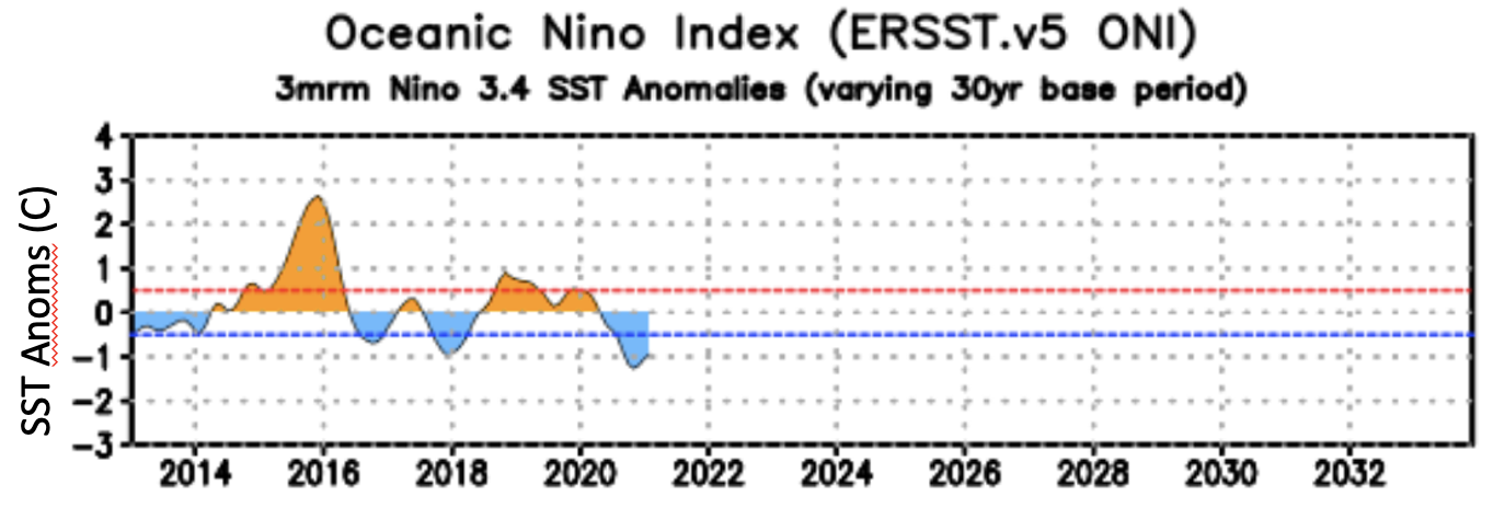La Niña conditions developed early in fall of 2020, and a moderate event persisted through the winter. Figure 1 shows the 3-month running mean of the sea-surface temperature (SST) anomalies for the Nino3.4 region of the equatorial Pacific Ocean (known as the Oceanic Nino Index) from 2013 through early 2021. The CPC issued a “La Niña Advisory” in September 2020, which happens to be still in effect at the time of this writing, and the SST anomalies in the equatorial Pacific Ocean were below -1°C for much of the winter. Currently, there is an expectation that the La Niña will transition to neutral conditions over the next several months. Early indications show about an equal chance of either La Niña or neutral conditions for winter 2021-22; we will be monitoring the state of the tropical Pacific because of its importance to the seasonal weather of the Pacific Northwest.