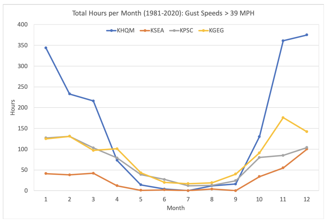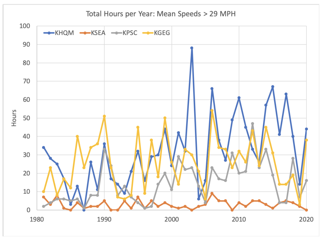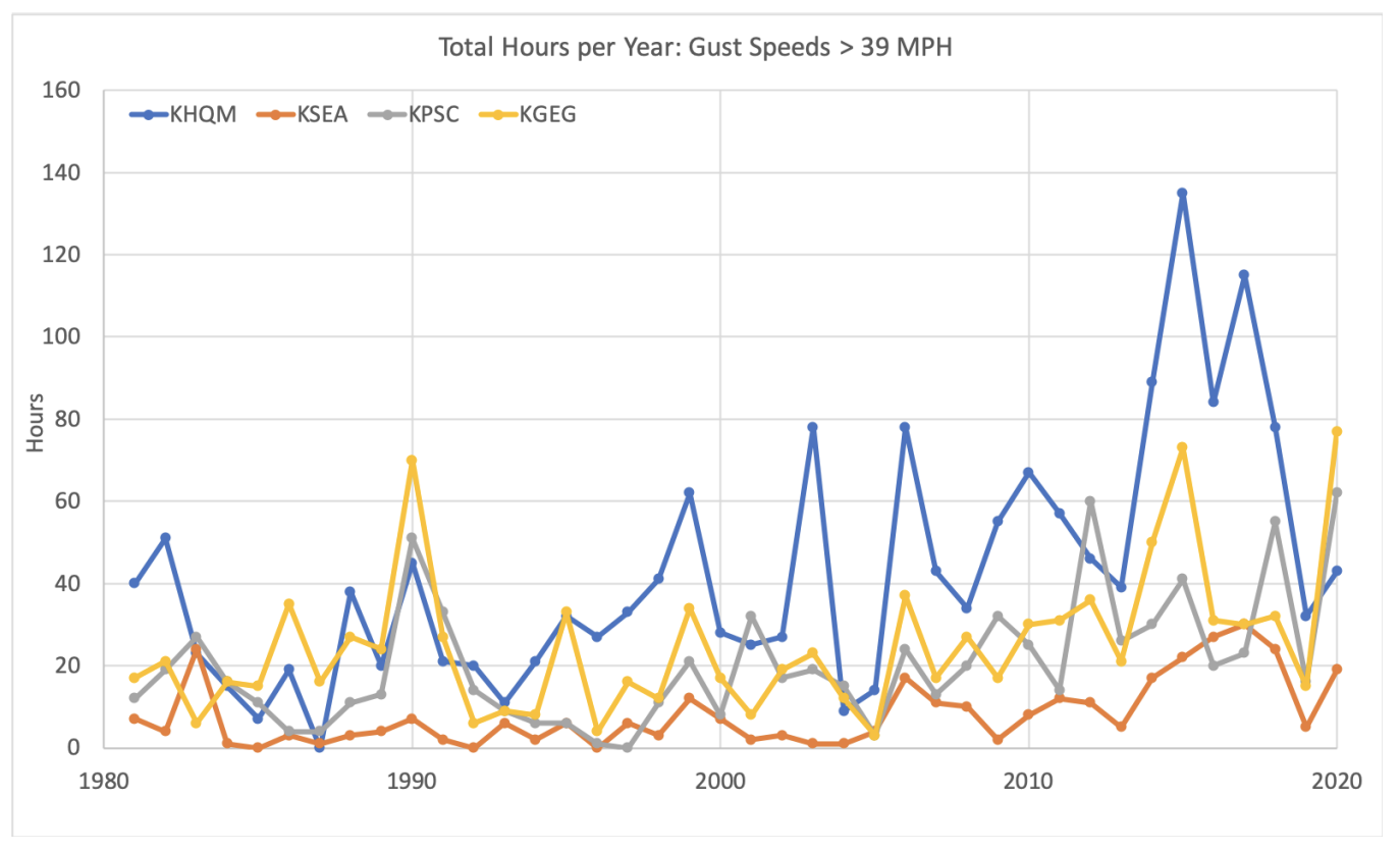 Daily temperature and precipitation data are available going back many years, and are generally used to summarize the variability in the climate, including long-term trends. There are other aspects of the weather and climate that are interesting and important, however, but are often more difficult to procure and are not widely disseminated. Here we consider the frequency of strong winds in three locations, based on hourly data, for the period of 1981 through 2020, using the slick app provided by the Midwestern Regional Climate Center. In particular, we have counted the number of hours per month for which the mean wind speed, and separately, the gust wind speed exceeded prescribed thresholds at Hoquiam (KHQM), SeaTac (KSEA), Tri-Cities (KPSC), and Spokane (KGEG). The results of this exercise are summarized below.