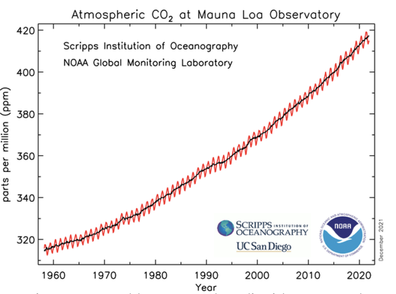 On a global scale, plants have a big impact on the carbon cycle by way of photosynthesis. As you likely learned in grade school, with sunlight, water, and carbon dioxide, plants create oxygen and food for themselves. This process allows plants to be a significant sink for anthropogenic carbon emissions. Figure 1 shows data from the longest record of direct atmospheric CO2 measurements in the world, taken at the Mauna Loa Observatory in Hawaii. The thick black line shows average monthly CO2 measurements corrected for the seasonal cycle; the red line shows the same, but without the correction. The red line moves up and down as plants in the northern hemisphere blossom and wilt with the seasons. The net effect of plants is to remove CO2 from the atmosphere and store it safely away in soils and plant tissues, where it does not act to heat up the Earth. In fact, about 25% of all fossil fuel emissions from humans have been taken up by plants and soils.