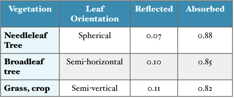 Plants can have a big impact on local climates, too. In the rainier regions of the Pacific Northwest, plants have plenty of water and warm enough temperatures to survive, so they are mostly limited by sunlight in the amount they can grow. This has an impact on the characteristics of the plants that grow here. Take the three most common trees in the Pacific Northwest as examples: The Douglass Fir, the Western Red Cedar, and the Western Hemlock. All of these trees are needleleaf trees. According to a study by Dorman and Sellers (1989), needleleaf trees reflect less and absorb more sunlight than broadleaf trees, grasses, and crops (Table 1). Thus, the widespread growth of dark, needleleaf trees in Western Washington allows for more sunlight to be absorbed on average, which helps to increase the surrounding temperature. In contrast, the sunnier areas of Eastern Washington are more sparsely vegetated. With fewer forests and vast swaths of farmlands, prairies, and even deserts, more sunlight is reflected. This helps to keep Eastern Washington cooler than it would otherwise be.