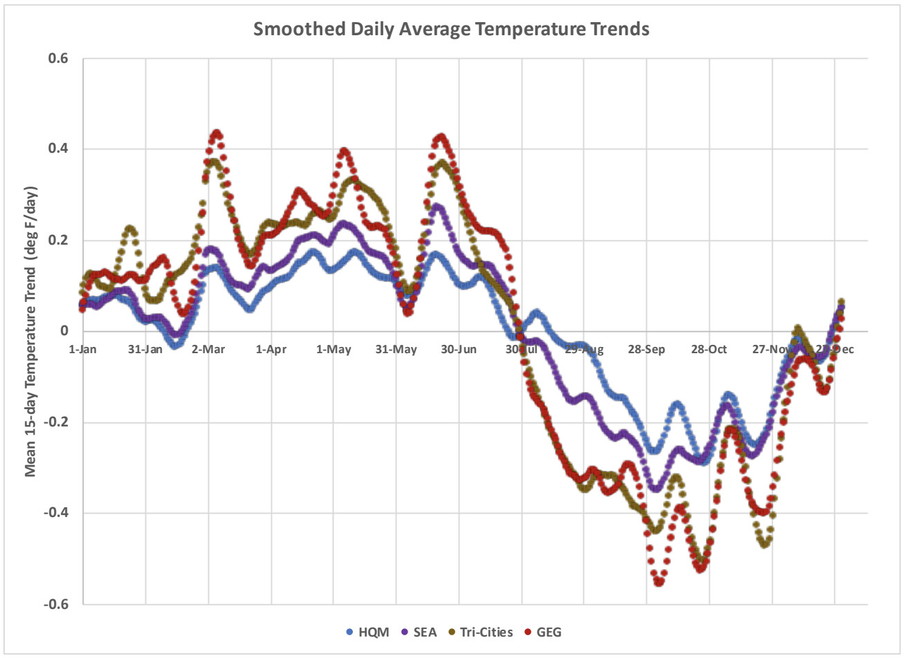 The present analysis is based on daily mean temperature and precipitation amounts for the years of 1991 through 2020 at four locations: Hoquiam (HQM), Sea-Tac (SEA), Tri-Cities, and Spokane (GEG). The mean temperatures and precipitation totals for each calendar date were subject to 15-day running-mean averaging to reduce the day-to-day variability associated with high-amplitude events that are reflected as noise in the 30-year means. Greater and lesser smoothing was explored with the single 15-day averaging appearing to strike a reasonable balance between filtering out much of the more or less random fluctuations while retaining meaningful seasonal trends on shorter time scales. For the temperature records, we also computed 15-day best-fit linear trends for each calendar date to better highlight the changes in average temperature over the course of the year. The results for temperature and precipitation are shown in Figures 1 and 2, respectively.