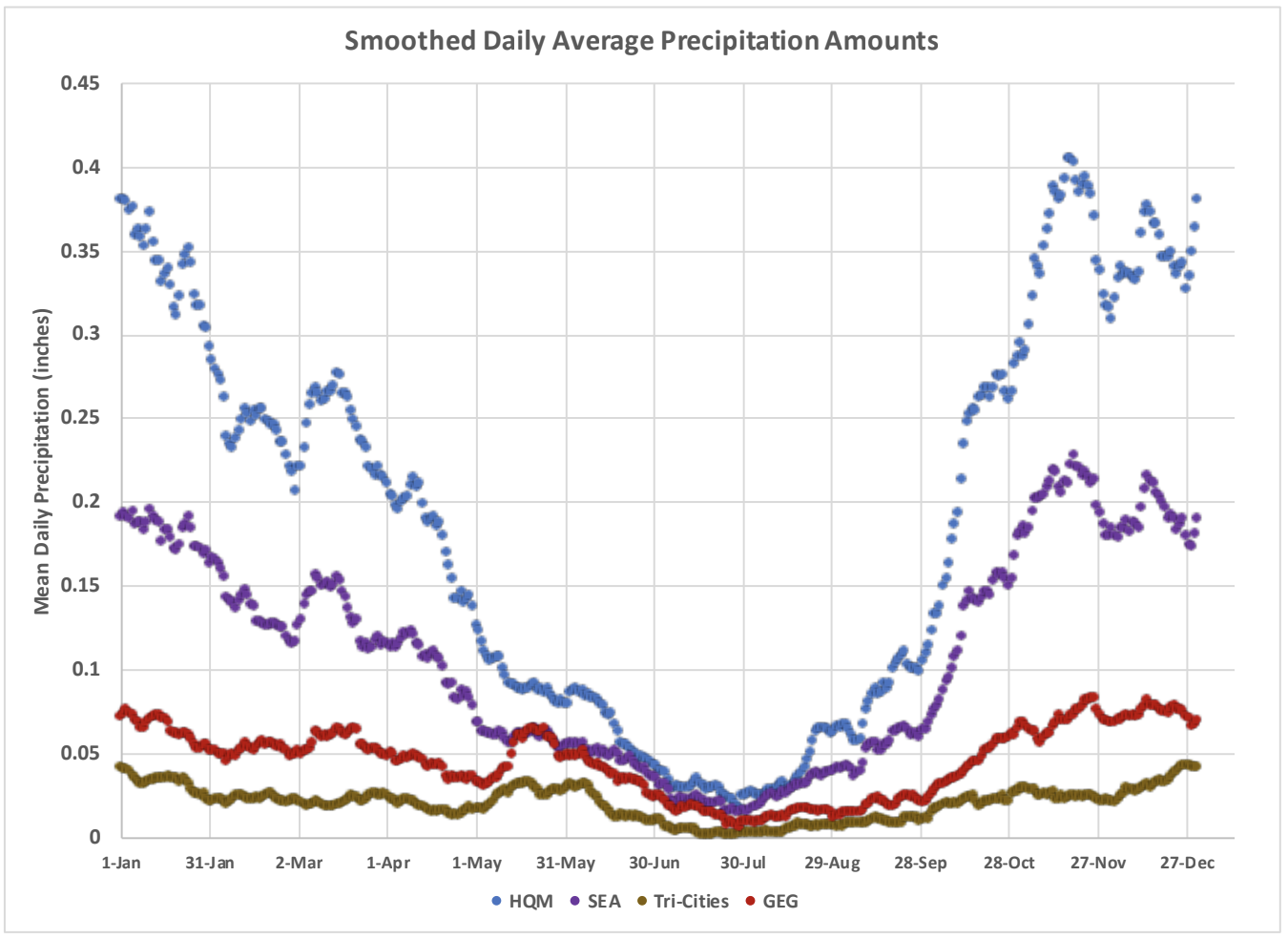 Normally, we would also be experiencing periods of significant rain, as illustrated by the precipitation time series of Figure 2. Daily average amounts really ramp up over the course of October; we are liable to get into a more typical weather pattern before too long, so consider yourself forewarned. At least for Sea-Tac and Spokane, it can be argued that the increase in precipitation (“fall”) occurs typically over an interval of 2 months (October and November). The period of decrease in precipitation west of the Cascades (at least at HQM and SEA) is from near the start of the calendar year into July, and by this measure “spring” is about 6 months long! The decreases in precipitation during the first half of the year are not nearly as marked in the Tri-Cities or Spokane. Those two locations happen to have local maxima in their mean daily precipitation from early May into June. Spokane has actually received slightly more precipitation than Sea-Tac during some days in late May for the 30-year period considered here.