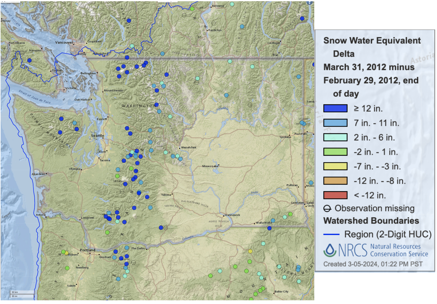 Here we use iMAP to contrast the change in SWE across WA state that has occurred during the warm and dry March of 1992 (Figure 1) versus its cool and wet counterpart during March of 2012 (Figure 2). These two periods represent bookends for what can happen to our snowpack during March. From a statewide perspective, March of 1992 was 5.4°F warmer than normal (using the 1991-2020 baseline) and the total precipitation was 3.56” below normal, representing the 2nd driest March on record. While there is usually growth in SWE in our mountains during the month of March, except for at lower elevations, the warmth and meager precipitation of March 1992 was bad news for the snowpack. Figure 1 shows that there were some locations that more or less broke even, but substantial losses were widespread, with some locations in the southern Cascades of WA state experiencing declines in SWE exceeding 8”. March of 2012 was a different story due to its temperature anomaly of -2.1°F and statewide average precipitation totaling 3.22” greater than normal. There have been other March months in the last couple of decades with colder temperatures, but 2012 stands out for being both cold and wet. Not surprisingly, there was major growth in the SWE in our mountains during March 2012 (Figure 2), with many stations recording increases greater than 12”. Figures 1 and 2 are just screen grabs; the application itself lets one easily check out other properties at individual locations by clicking on a station. OWSC closely monitors the evolution of the snowpack in the Pacific Northwest, especially during the present time of year. We are grateful that that is so easy to do, thanks to iMAP.