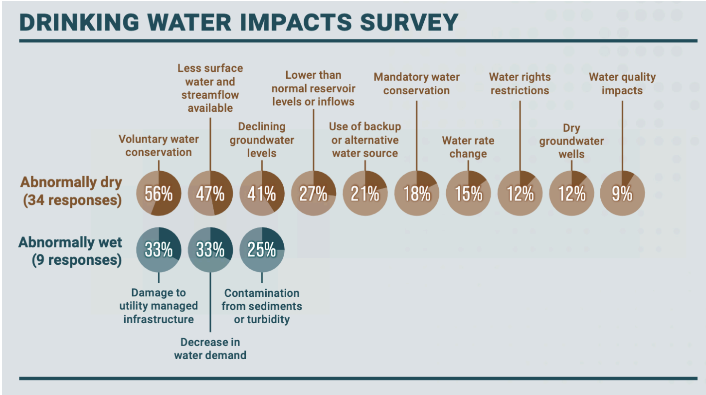 Various impacts were reported throughout the PNW in response to 2023 water year conditions. For example, drinking water, agriculture, forestry, fisheries, and hydropower were all affected by abnormally dry conditions. The assessment features a call-out box in Seattle City Light hydropower impacts. In addition, there were various voluntary, and even some mandatory, water restrictions. The assessment provides more details by sector; a sample summary of the impacts for drinking water is shown in Figure 2.