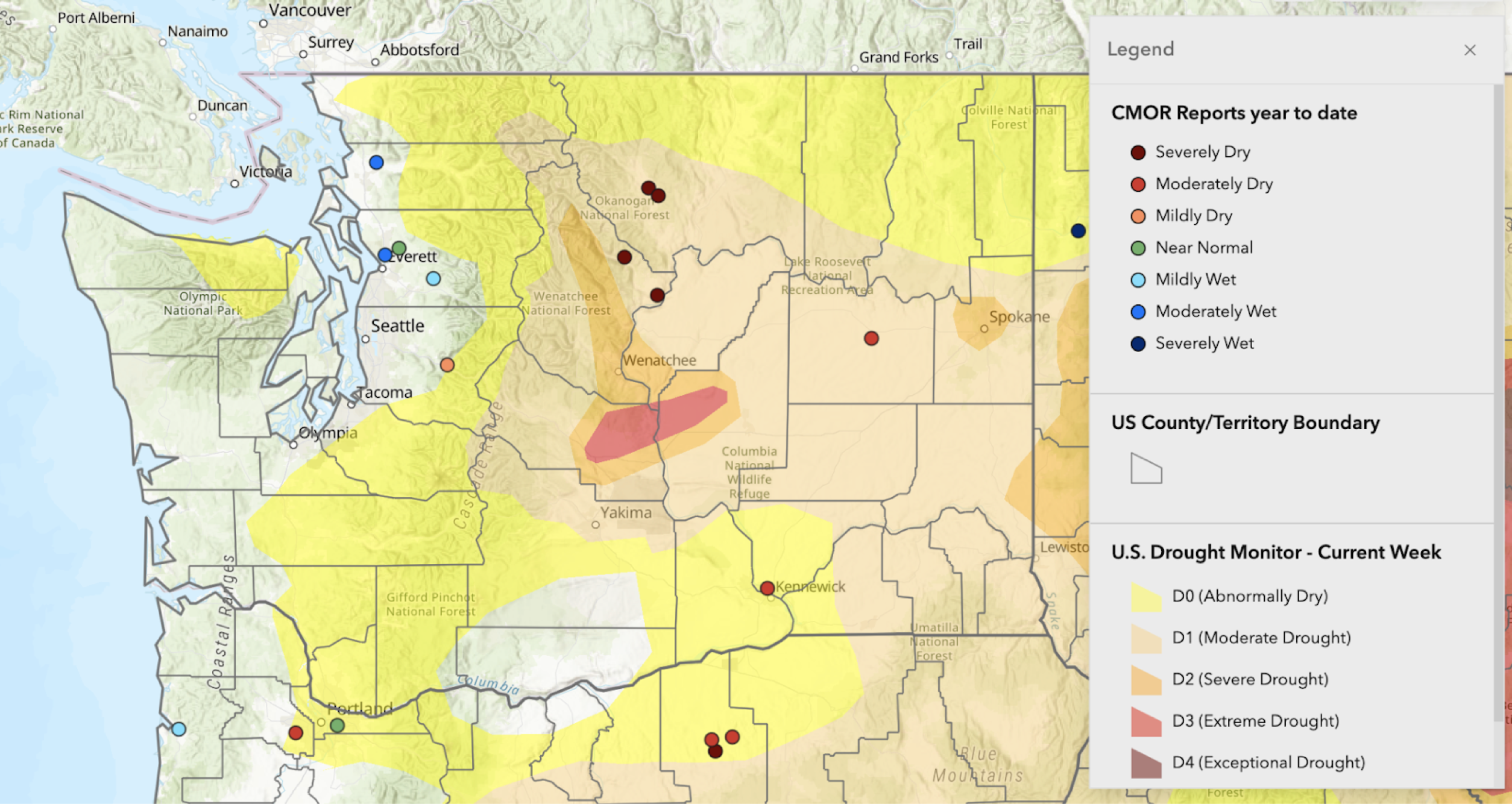 The Condition Monitoring Observer Reports on Drought (CMOR-Drought) is a collaborative effort by the National Drought Mitigation Center (NDMC), USDA Climate Hubs, and NOAA National Integrated Drought Information Systems (NIDIS) to document drought impacts across the nation since 2018. We typically post a link to the survey in the “Drought Update” section of the monthly newsletter. Anyone can fill out the survey at any time during the year. The point is to share observations about the environmental conditions around you — whether that location is home, work, a road trip, etc. In the survey, you can rate conditions on a scale from severely dry to severely wet. There are five categories in between: moderately dry, abnormally dry, near-normal, abnormally wet, and moderately wet. In the survey, you can list impacts related to agriculture, municipal water supply, hydropower, public health, recreation, industry, forestry, and wildlife. A useful feature of the application is the ability to upload photos, which can go a long way in describing on- the-ground conditions. As the saying goes: a picture is worth 1000 words.OWSC uses these reports in our drought monitoring efforts in a number of ways. They allow us to have “eyes on the ground” and ensure we are accurately representing impacts across Washington State. For example, if we see several CMOR reports for a particular location, we might look more closely at other meteorological datasets and drought indices for that location, to make sure we understand how drought conditions are evolving there. And we can bring that information back to the state as we help them monitor for drought.