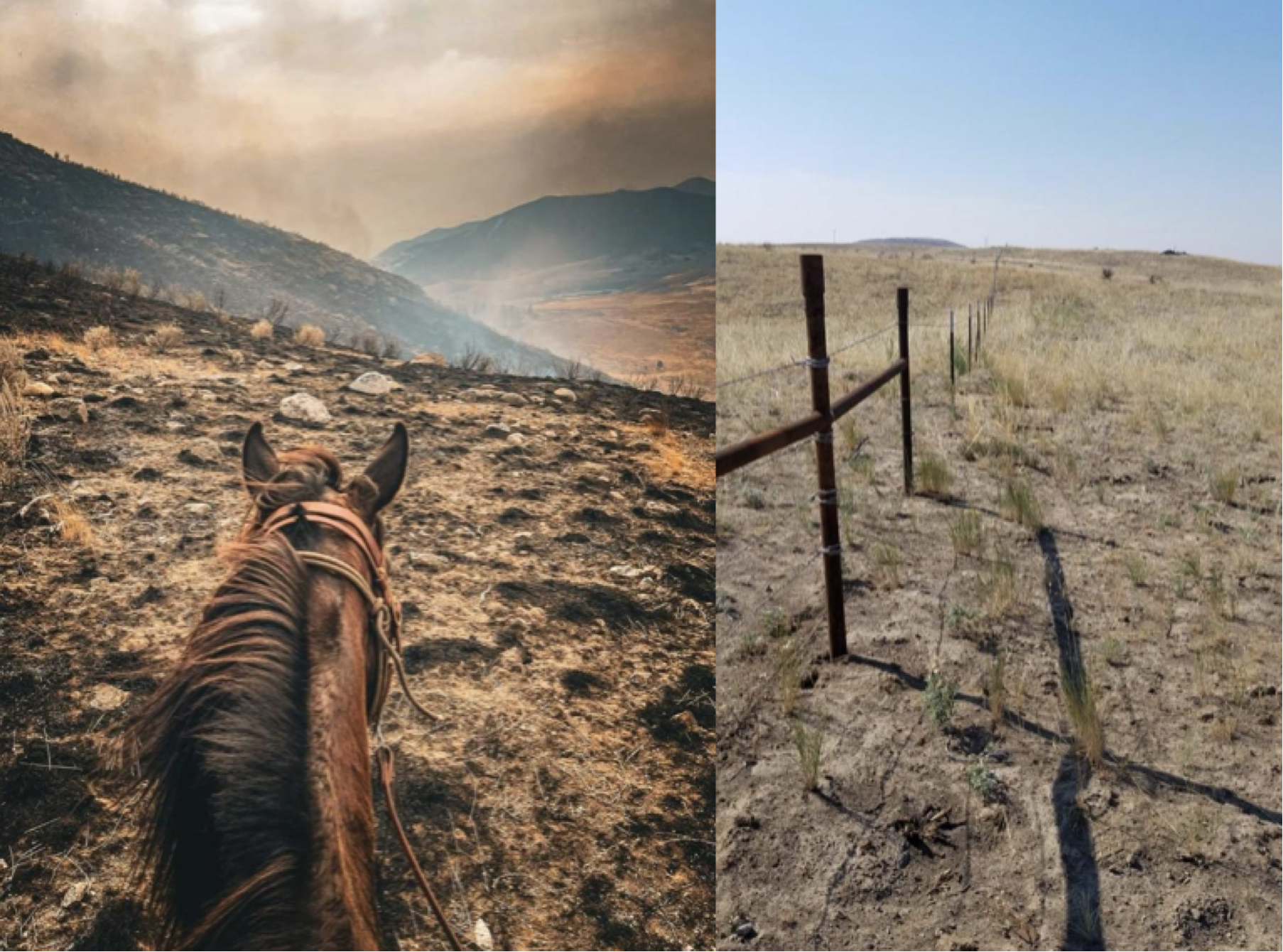 All the reports from the beginning of the year are shown in Figure 1. Two “moderately wet” reports in Snohomish and Skagit counties were reported in May and June, respectively. In July, five reports were made ranging from mildly dry to severely dry: two in Okanogan county, two in Chelan county, and one in King county. Both of the reports from Okanogan county were made on July 21. The first reports severely dry conditions county-wide and poor crop conditions as well as very poor range conditions with less water for irrigation, reduced yields, insect infestations, plant stress, the need for supplemental feeding for livestock, and less water in ponds/creeks. This report included photos of a fire burning through local rangeland with clearly visible wildfire smoke, one of which is reproduced here (Figure 2). The second report from Okanogan county on July 21 focused more on the hot and dry conditions throughout the Methow Valley impacting livestock. This reporter mentions needing to buy hay for supplemental cattle feed, decreased stock weights, and animal stress. This reporter also has concerns about having lighter calves at weaning. A photo of poor pasture conditions is included with the report (Figure 2).