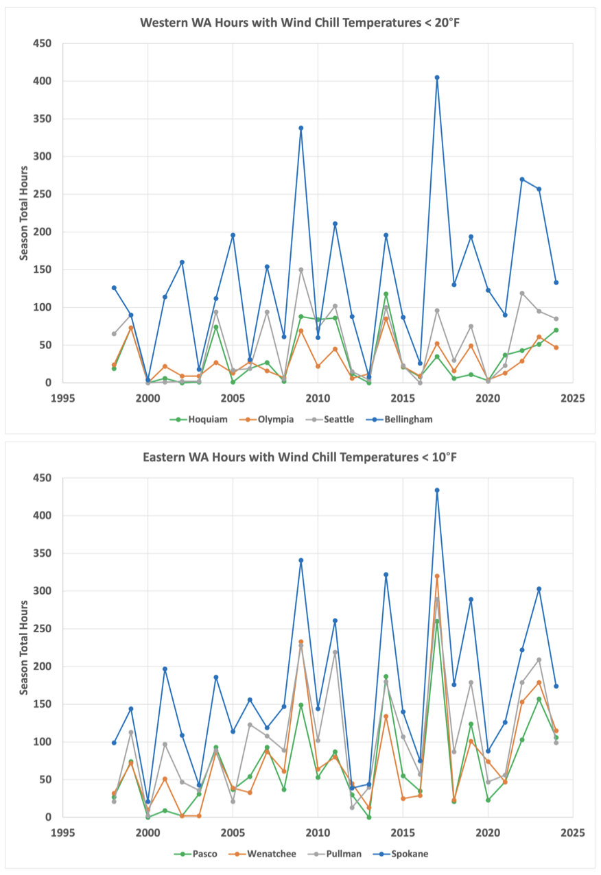We focus here on the number of hours during the past cool seasons (October to March of 1997-98 through 2023-24) with wind chill temperatures below specific thresholds. We selected the threshold of values less than 20°F for the west side of WA, and examined the records for Hoquiam, Olympia, Sea-Tac and Bellingham; for the colder east side we selected a threshold of 10°F and looked at Pasco, Wenatchee, Pullman, and Spokane International Airport. It turns out that hourly wind chill temperatures in the MRCC database do not extend as far back into the past as other meteorological variables. This means these time series are better for looking at year-to-year variability rather than long-term trends.