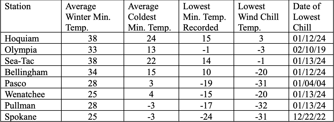 To set the stage, we first provide some information on the mean winter climate of the 8 WA stations considered here. Table 1 below shows the average daily minimum temperature for winter (Dec-Feb), the average coldest minimum temperature of the year, and the single lowest hourly temperature recorded, all for the 30-year period of 1991-2020 that is generally used to represent current climatological norms. For good measure, we also throw into Table 1 the single lowest wind chill temperature for the winters of 1997-98 through 2023-24, recognizing that this record starts and ends later than that used for the other metrics.