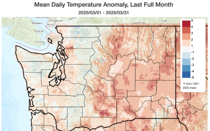 Temperatures were above normal for the vast majority of the state, with anomalies of around 1-2°F above normal across western Washington and around 2-4°F above normal across eastern Washington. This includes a +3.5°F anomaly in Spokane and a +3.2°F anomaly in Pasco, as is shown in the table below. Statewide, temperatures were +1.9°F above the 1991-2020 normal, and March 2025 ranked the 20th warmest March since 1895. The warm spell in late March played a large role in these warm anomalies, as much of the rest of the month featured near normal or only slightly above normal temperatures at most stations.